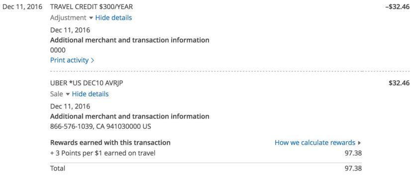 So any transaction that falls into one of the above categories should trigger the credit, which posts instantly on your account. Better yet, if you've already used your $300 credit for 2016, you don't have to wait until January 1, 2017 to tap into next year's credit — as you can see below, my credit reset earlier this week, since it's tied to your December statement date rather than the end of the calendar month.