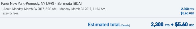 New York (JFK) to Bermuda (BDA) for 2,300 points + $5.60 one-way in March:
