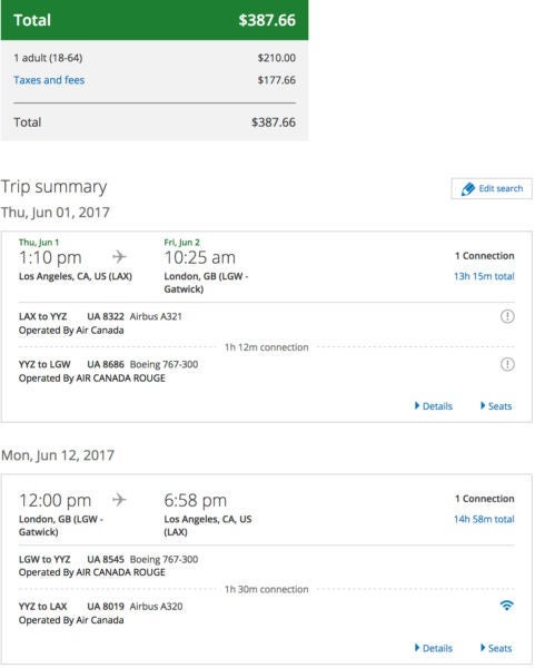 Los Angeles (LAX) to London (LGW) for $388 round-trip on Air Canada: