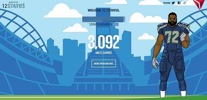 Now that we are headed into the NFL playoffs, Delta's letting us know just how popular this promotion was and how the Seahawks' on-field performance has added up for 12status members. According to an infographic from the airline, Seattle threw for 2,158 passing yards during the regular season and "nearly 30,000" 12status members have registered for a total of 55 million miles. When you check the 12status website, you'll see the exact numbers: 27,445 members and 55,159,275 SkyMiles.