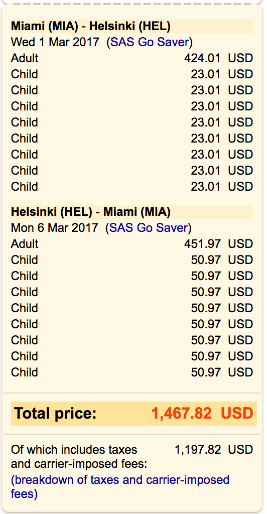Miami (MIA) to Helsinki (HEL) for $1,468 round-trip for 1 adult and 8 kids: