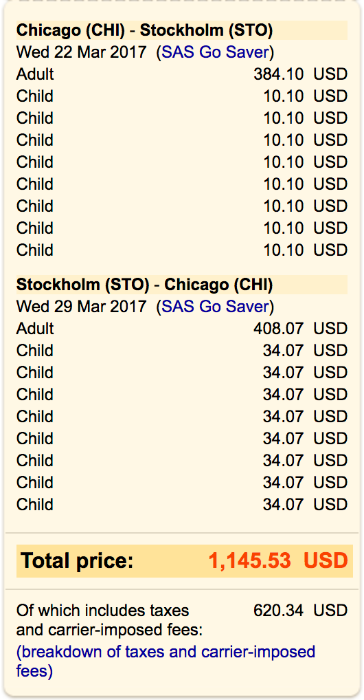 Chicago (ORD) to Stockholm for $1,146 round-trip for 1 adult and 8 kids: