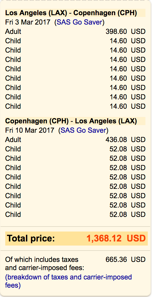 Los Angeles (LAX) to Copenhagen (CPH) for $1,368 round-trip for 1 adult and 8 kids: