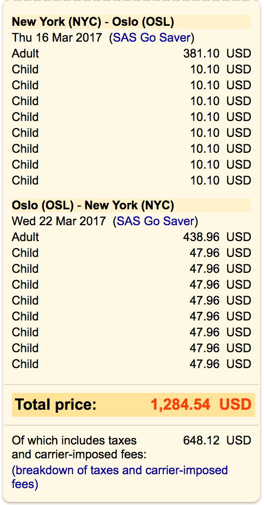 Newark (EWR) to Oslo (OSL) for $1,285 round-trip for 1 adult and 8 kids: