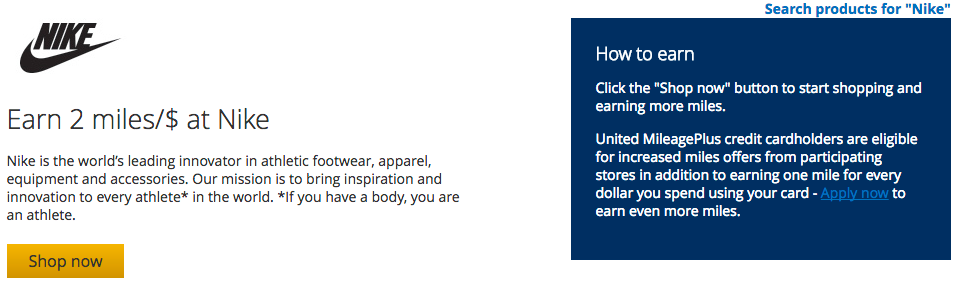 Earn two miles per dollar at Nike through United Mileage Plus Shopping.