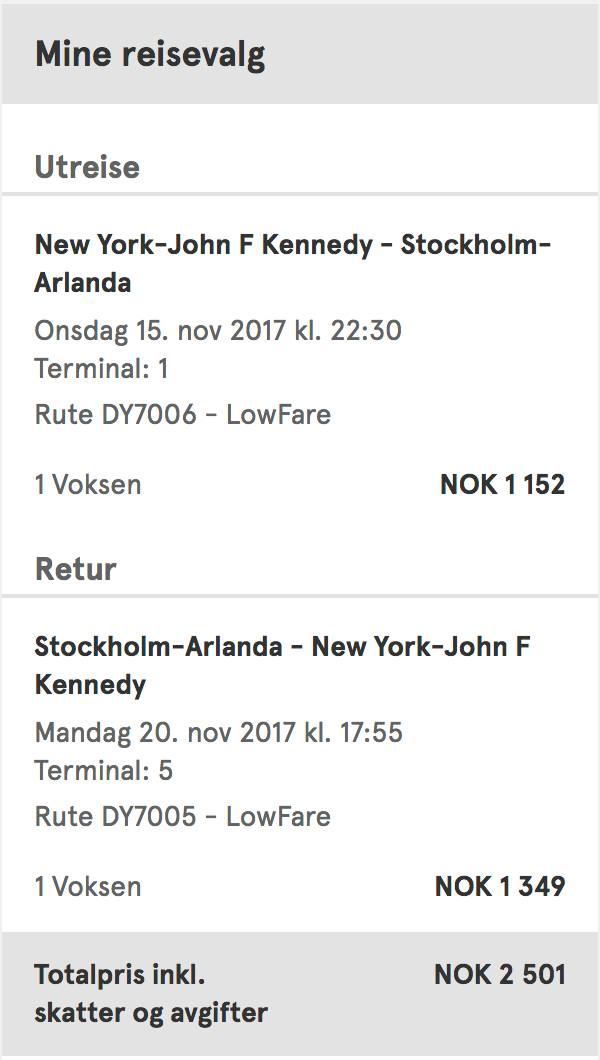New York (JFK) to Stockholm (ARN) for 2,501 NOK (US$292) round-trip on Norwegian: