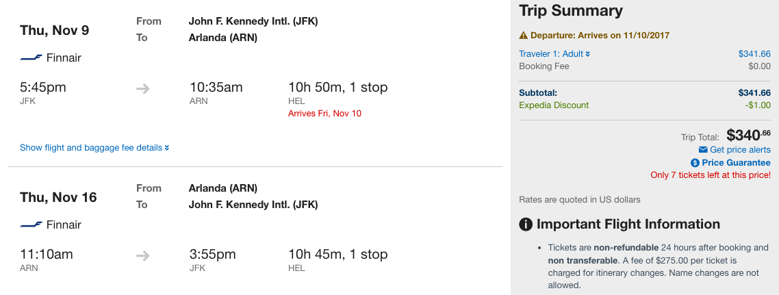 New York (JFK) to Stockholm (ARN) for $341 round-trip on Finnair: