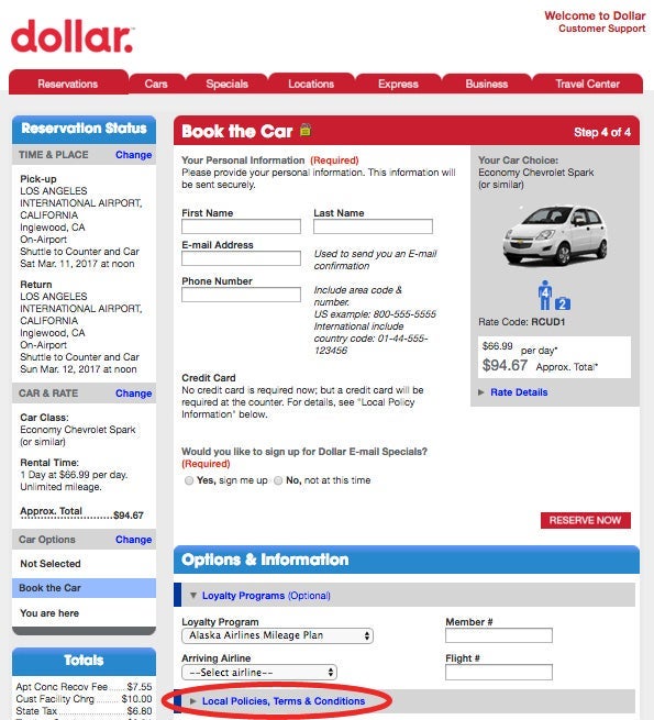 But in other cases, it takes extra work to realize you'll be charged for the miles. Dollar doesn't disclose this charge directly next to the option when booking online. Instead, you have to click on the "Local Policies, Terms & Conditions" link to find it spelled out...