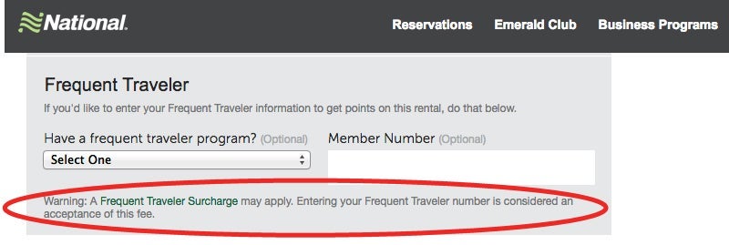 In some cases, such as when booking with National Car Rental or several other companies, you'll see this stated clearly right next to the option to select a loyalty program, though you might still need to dive into the terms and conditions in order to figure out what the actual fee will be.