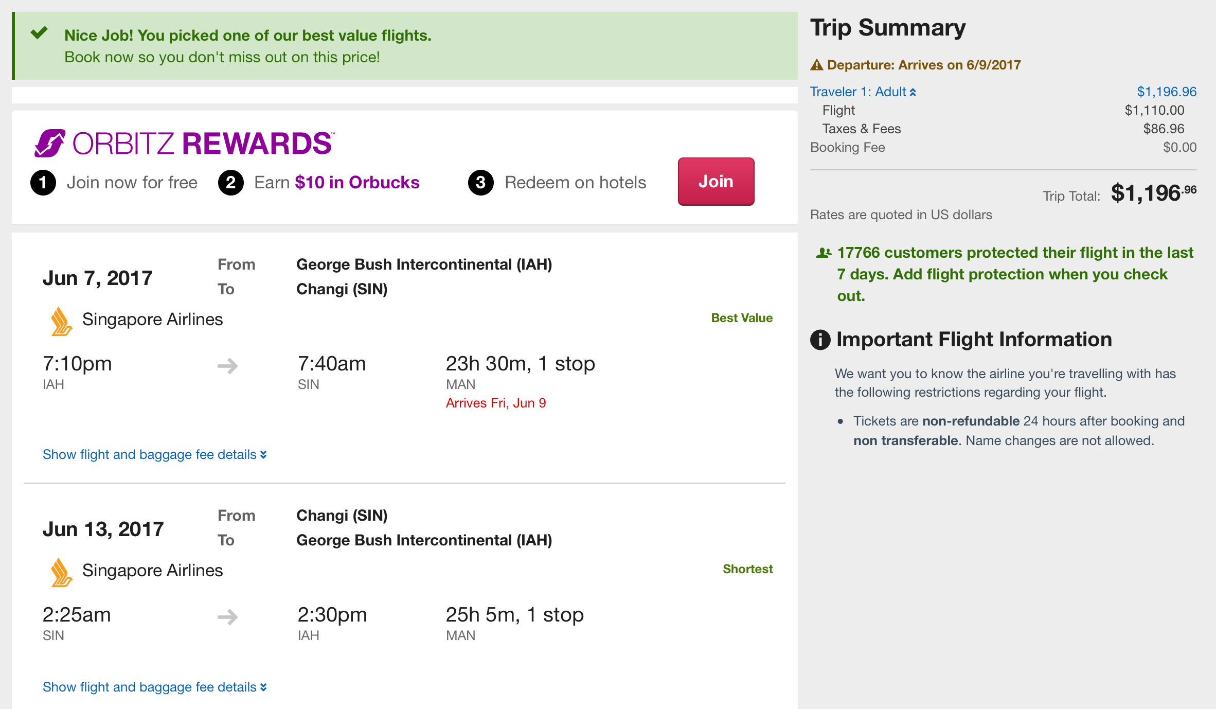 Houston (IAH) to Singapore (SIN) for $1,197 round-trip in June via Orbitz:
