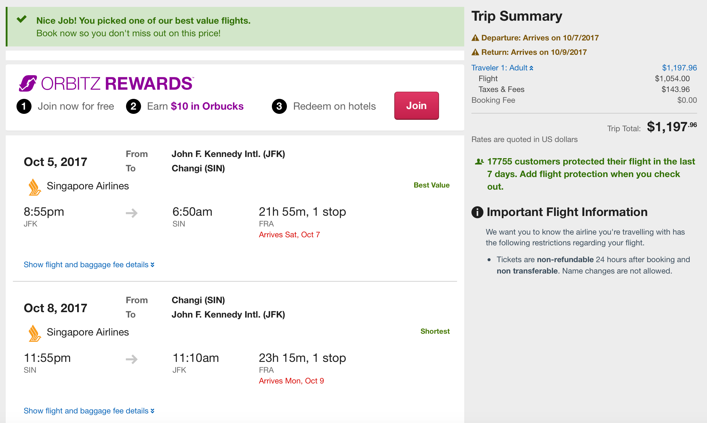New York (JFK) to Singapore (SIN) for $1,198 round-trip in October via Orbitz: