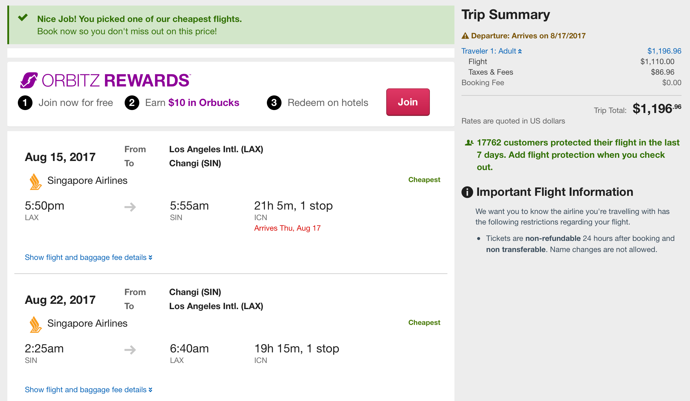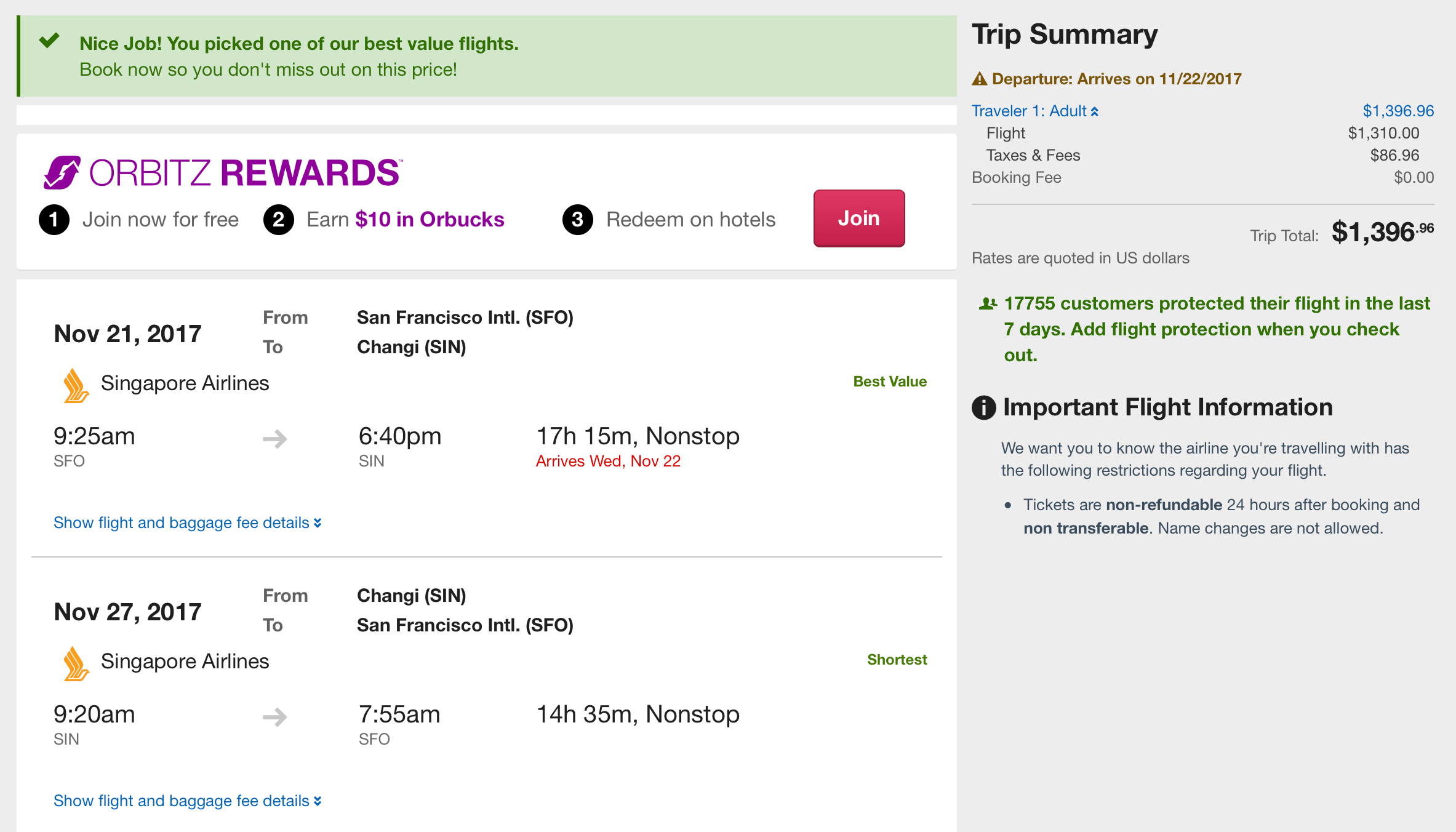 Airfare deals are typically only available on limited dates. We recommend you use Google Flights to find dates to fly, then book through an online travel agency, such as Orbitz or Expedia, which allows you to cancel flights without penalty by 11pm Eastern Time within one day of booking. However, if you're using the American Express Platinum Card, you'll need to book directly with the airline or through Amex Travel portal to get 5x MR points. Remember: Fares may disappear quickly, so book right away and take advantage of Orbitz or Expedia's courtesy cancellation if you're unable to get the time away from work or family.