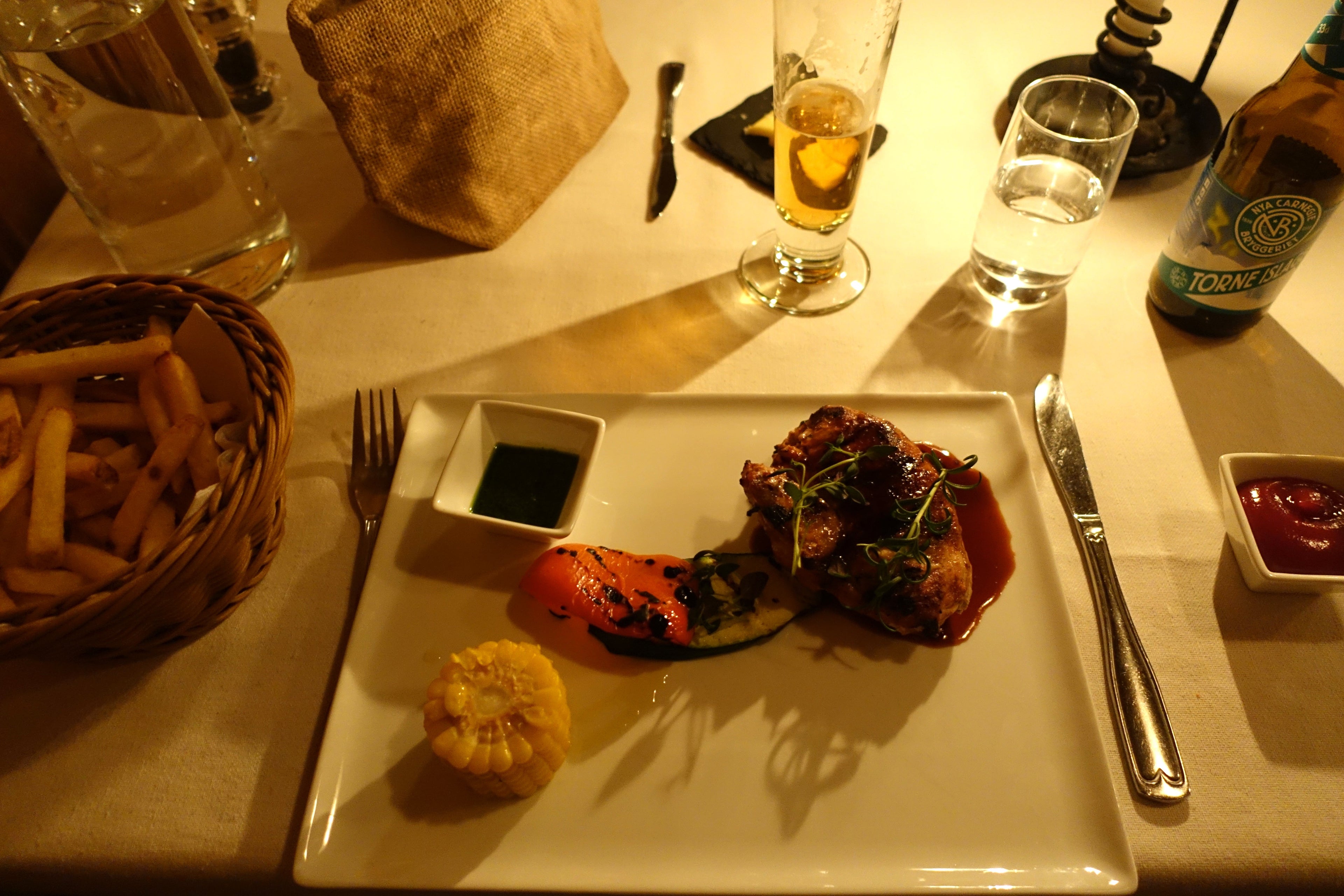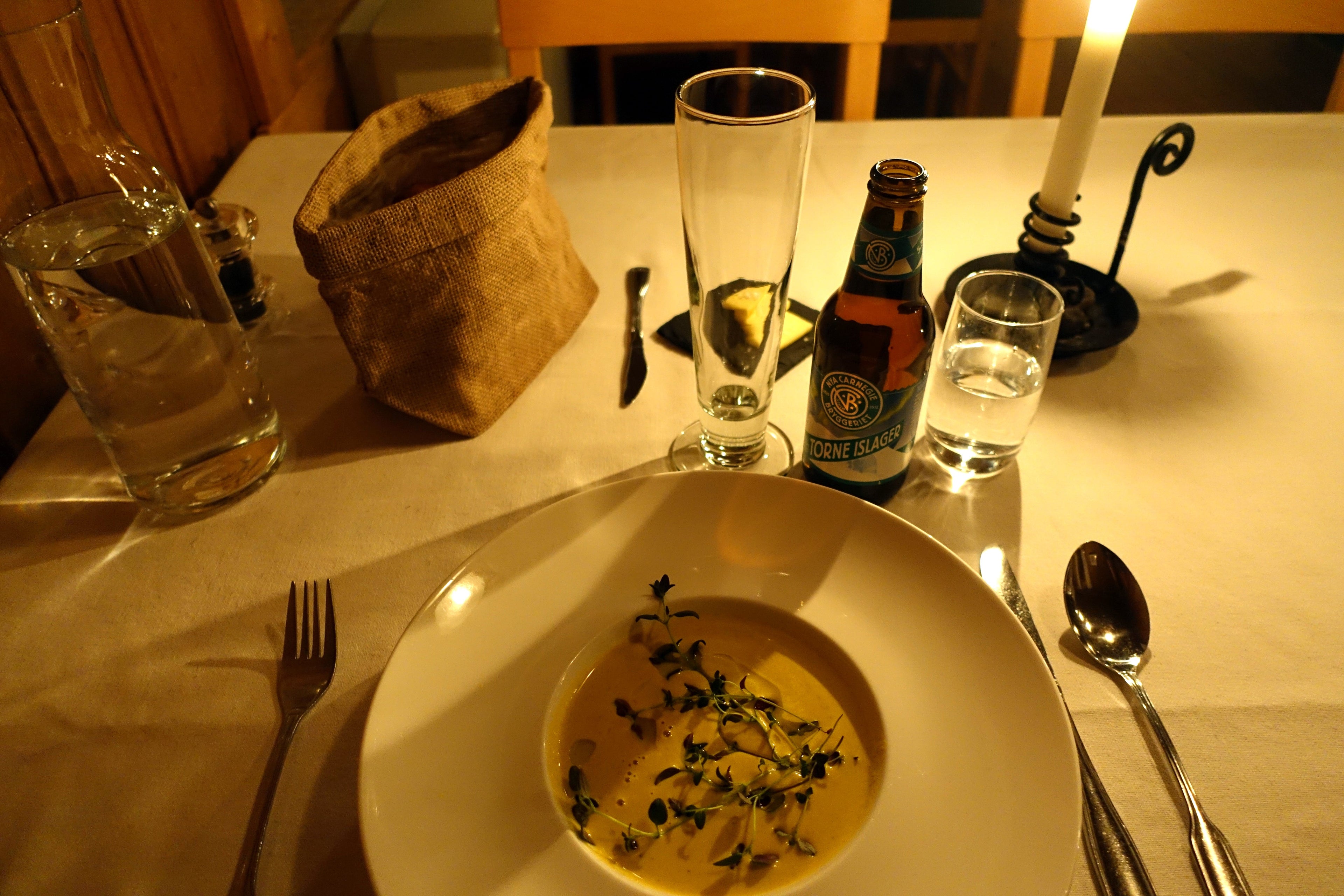 The Icehotel encourages guests to make reservations, which I did easily. Inside, the decor was charming and quaint — I really felt like I was in Lapland. To start, I had a vegetable soup, which was delightful. I had to try the Torne Islager beer, brewed locally with water from the Torne River. If you're in the area, you should try it, too.