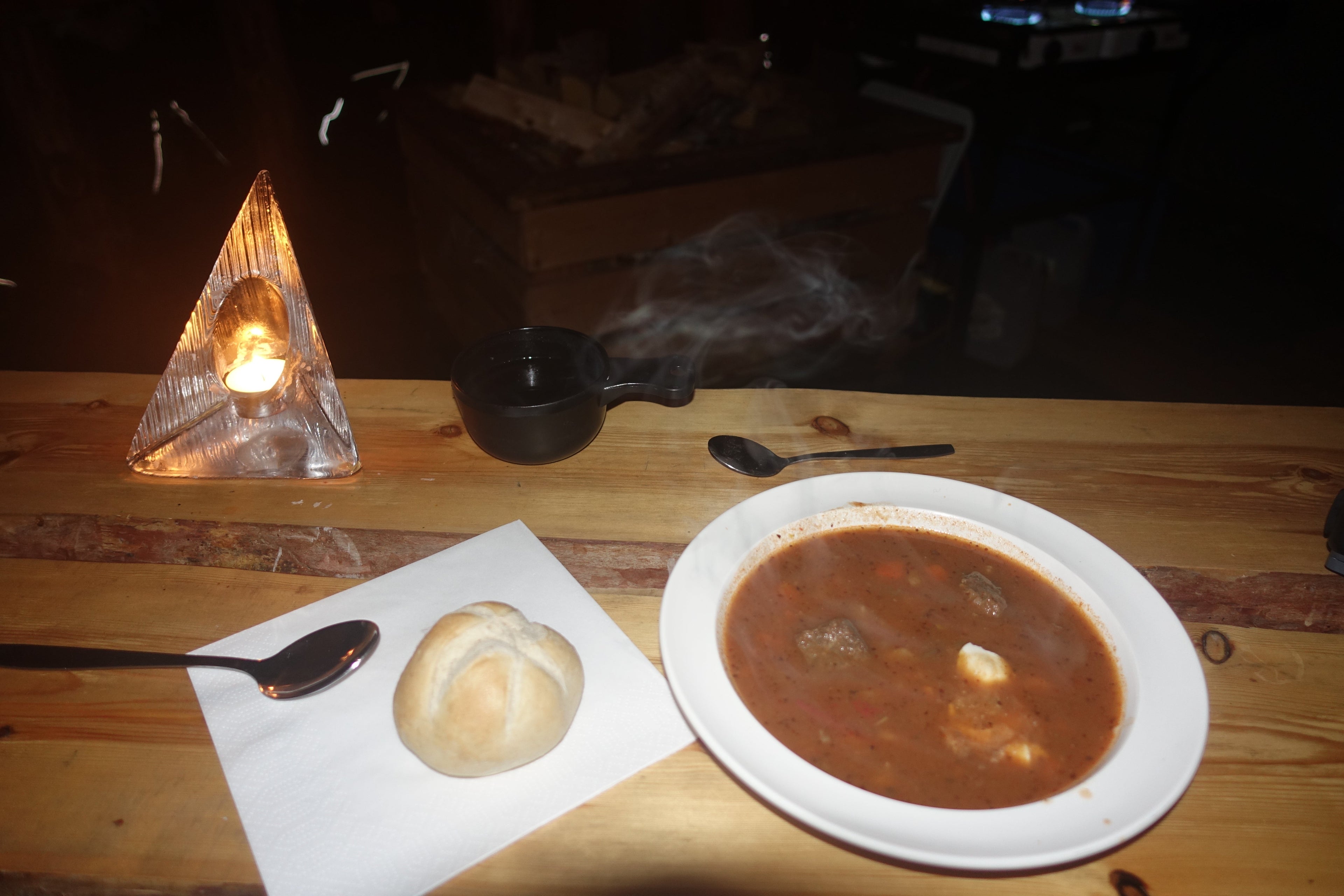 We arrived at a remote campsite about an hour outside the Icehotel that was perfect for viewing the Northern Lights. In the cabin, we were served a warm dinner of reindeer and elk stew, which was pretty good, and dessert. Since we were in Swedish Lapland, we were also served hot lingonberry juice.