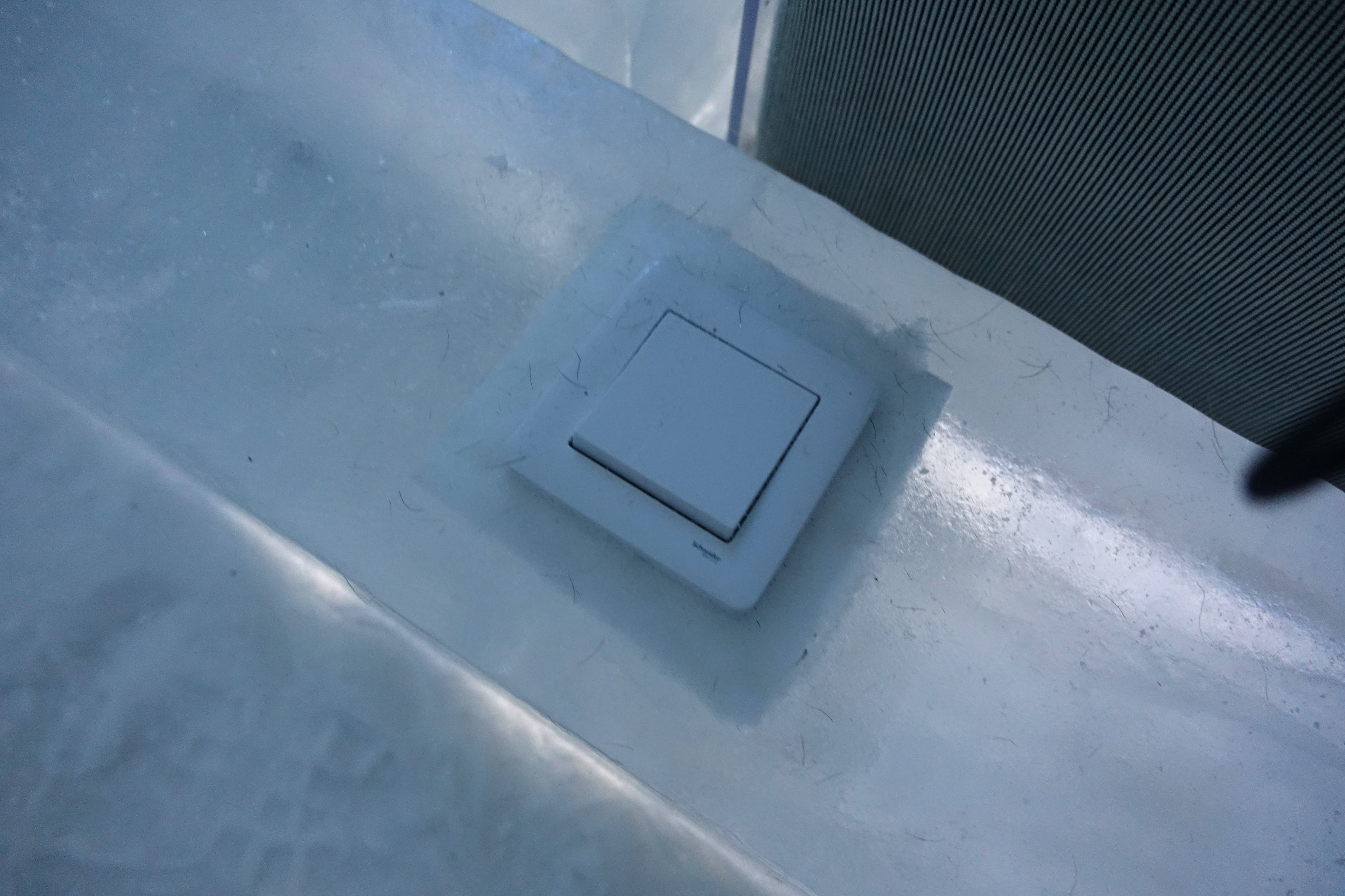 One thing I noticed about the room is that it was pretty dark — there's not much lighting in the suite. The little light there is comes from the circular shape above the bed and the wall of rectangles in front of the bed — they're LED lights, so they don't produce any heat. There are two light switches in the room — one next to the door when you first walk in and one directly next to the head of the bed. The location of the latter one is ideal — you can flip it off when you're about to go to bed so you're not struggling to take your boots off in the dark. When the lights go off, it's really, really dark — pitch black — and you truly cannot see or hear anything around you.