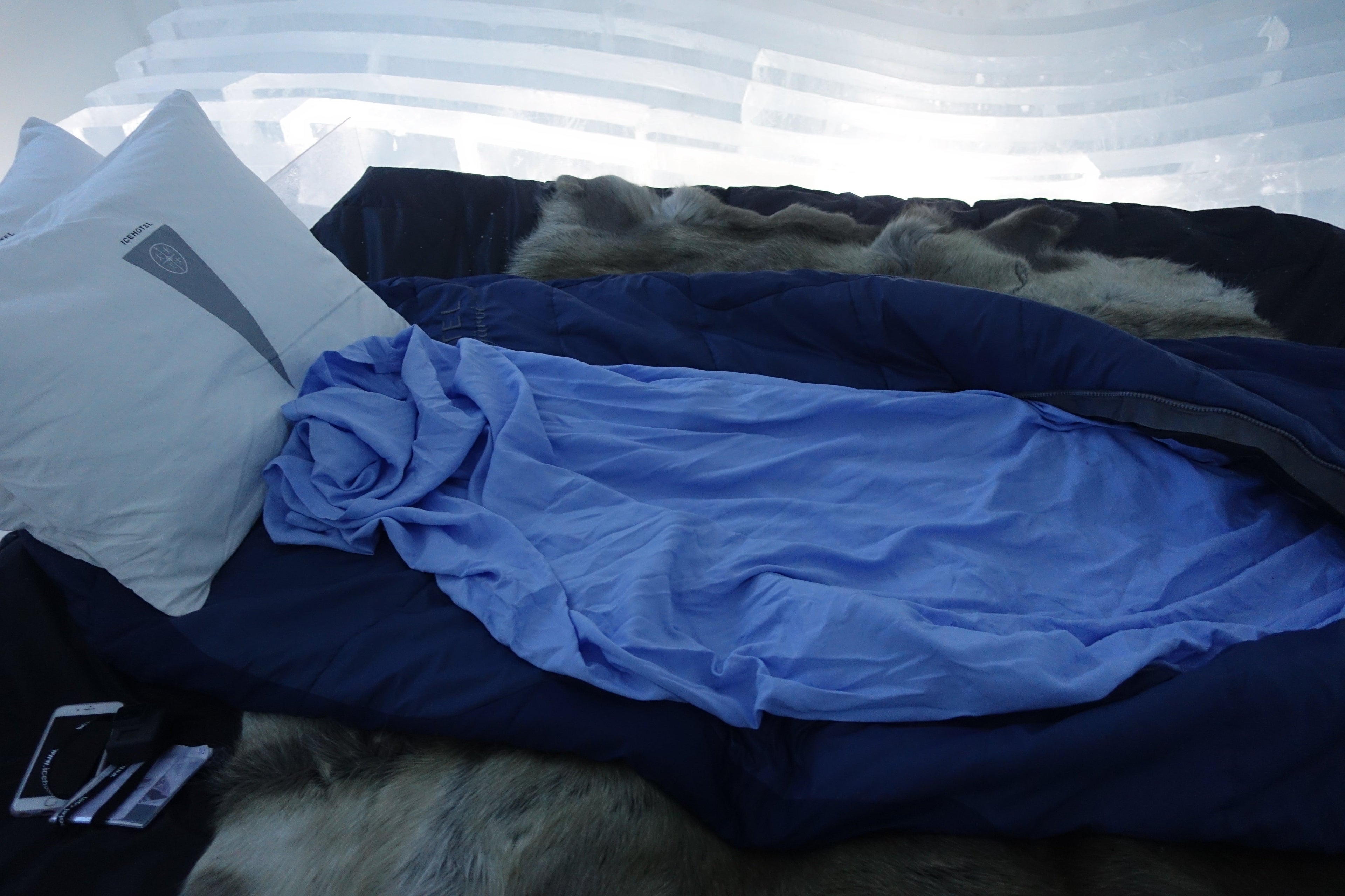 You don't actually sleep on the ice, by the way, as that would be flat-out uncomfortable. You do get a mattress — it was very comfy — along with a black mattress pad that acts as an extra layer of insulation so your body heat doesn't melt the ice, as well as two sets of reindeer hides. When I was ready to go to bed, I stopped by the "Cold Room" reception desk and pick up a thermal (and incredibly warm) sleeping bag and sheet.