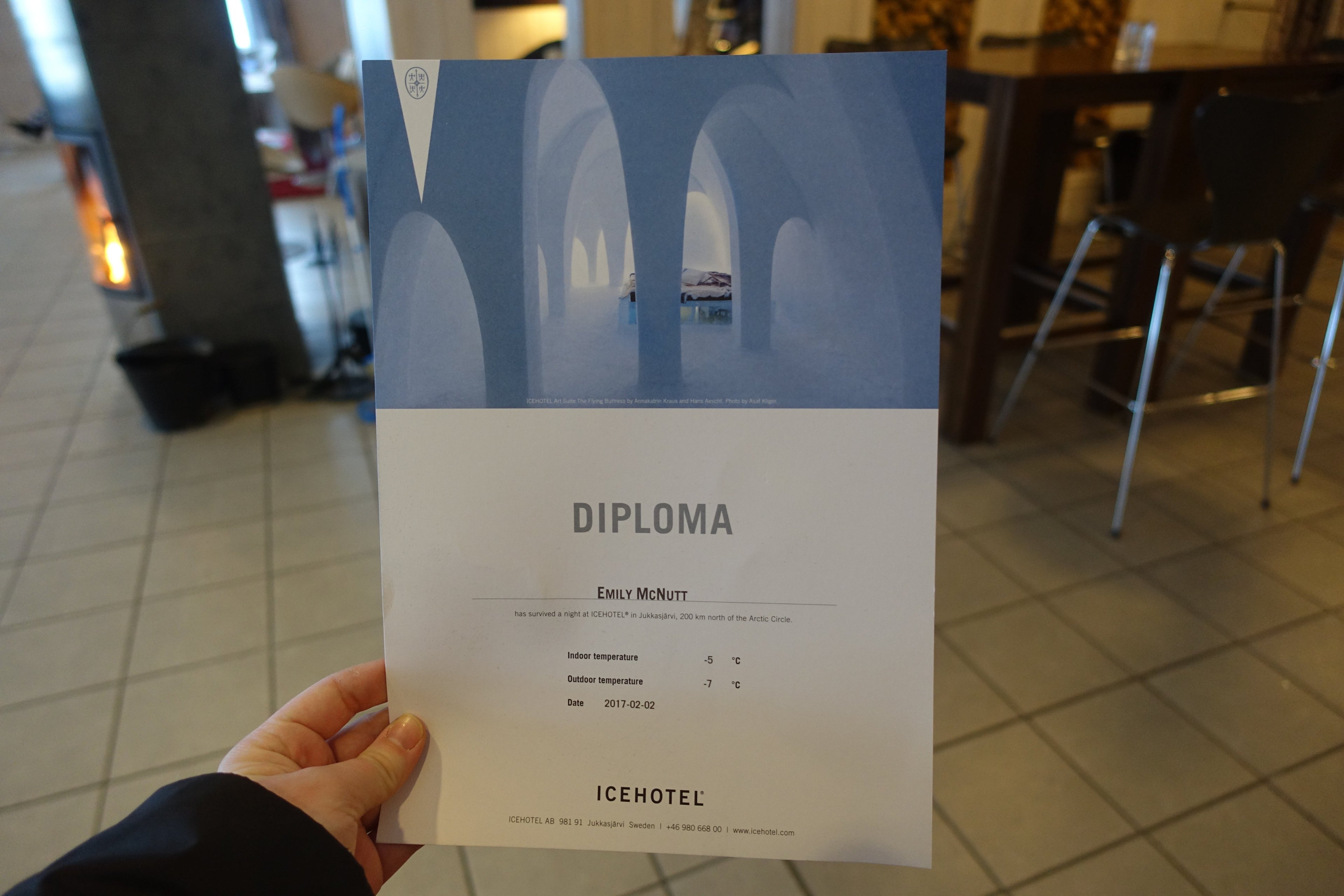 Upon checking out from the "Cold Room," the Icehotel gives you a diploma so you can remember your stay and how cold you were during the night. I thought this was such a cute little souvenir.