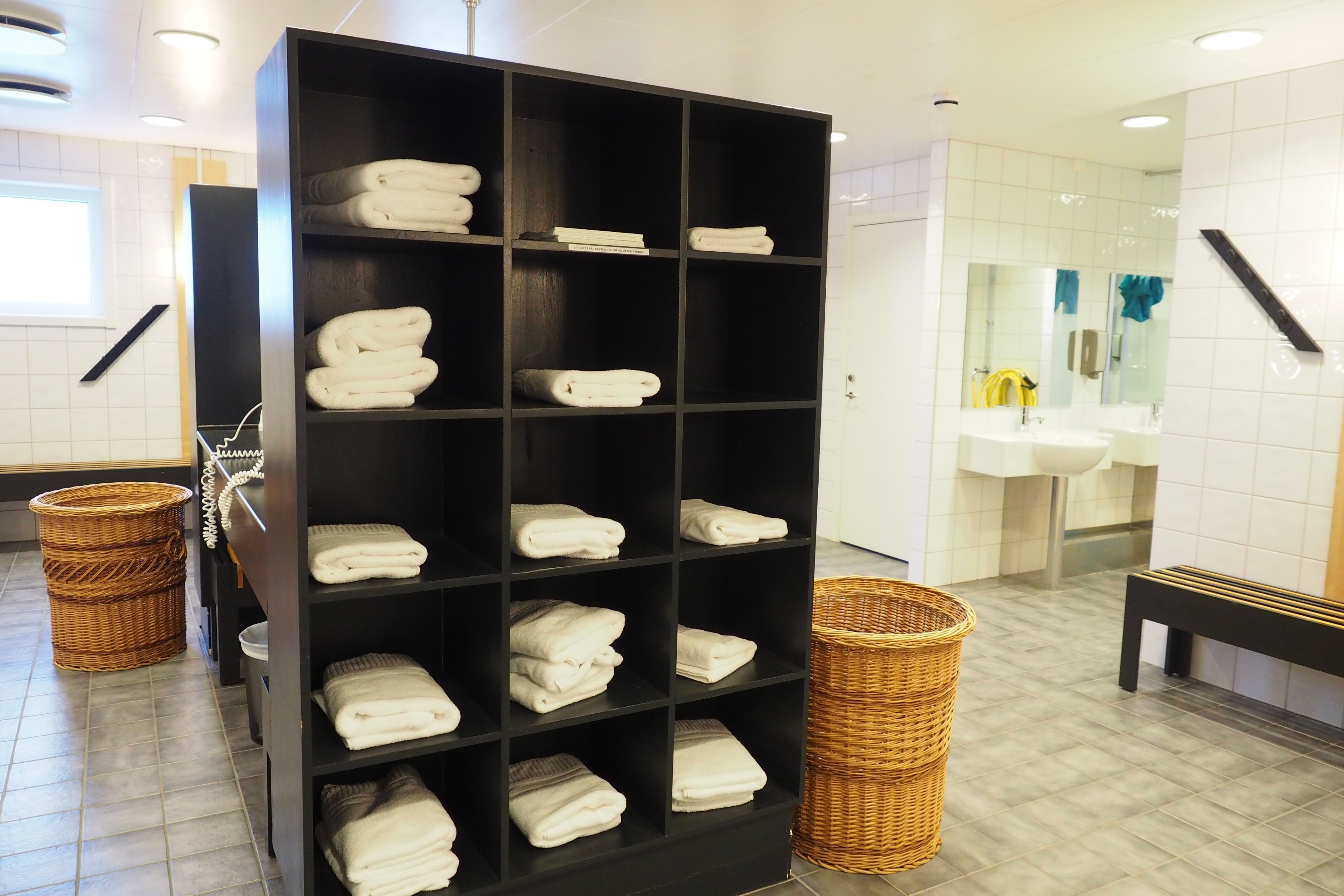 Unlike the unisex bathroom inside the 365 building, the ones in the Cold-Room Reception building are separated. The women's room was very communal-feeling. When you walk in, there's a shelf with towels to use for the shower or sauna.