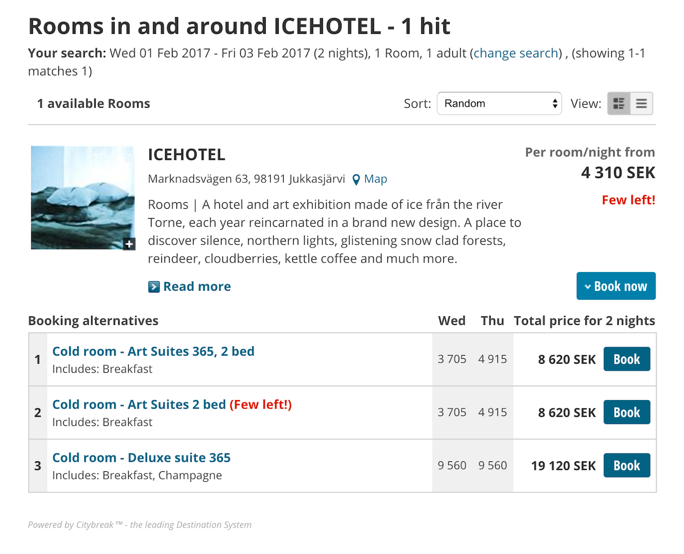 On the dates I was looking for, only "Cold Rooms" (as opposed to "Warm Rooms," which are basically like staying in a regular hotel) in the 365 building were available when I checked the Icehotel's website. Note that prices mentioned below for my stay reflect the value of the Swedish Krona at the time I booked.