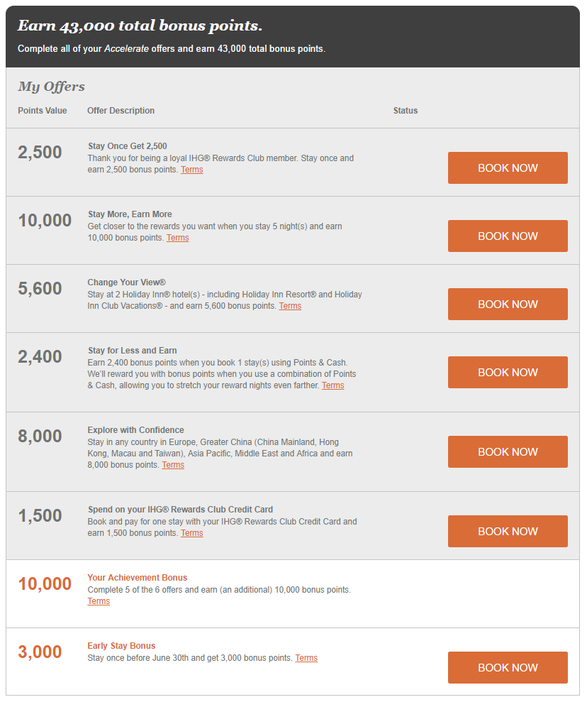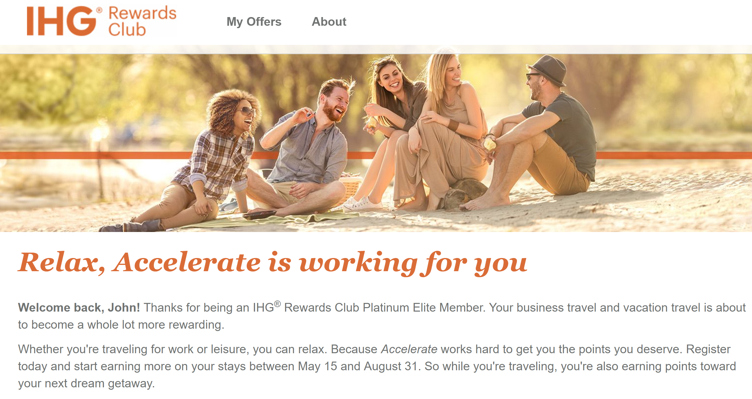 A few times a year, IHG offers its Rewards Club members an individualized slate of "Accelerate" challenges. Challenges include staying a certain number of nights, at a certain number of brands or using a certain type of rate plan (i.e., Points and Cash). Each member's offer seems to be based on past IHG activity.