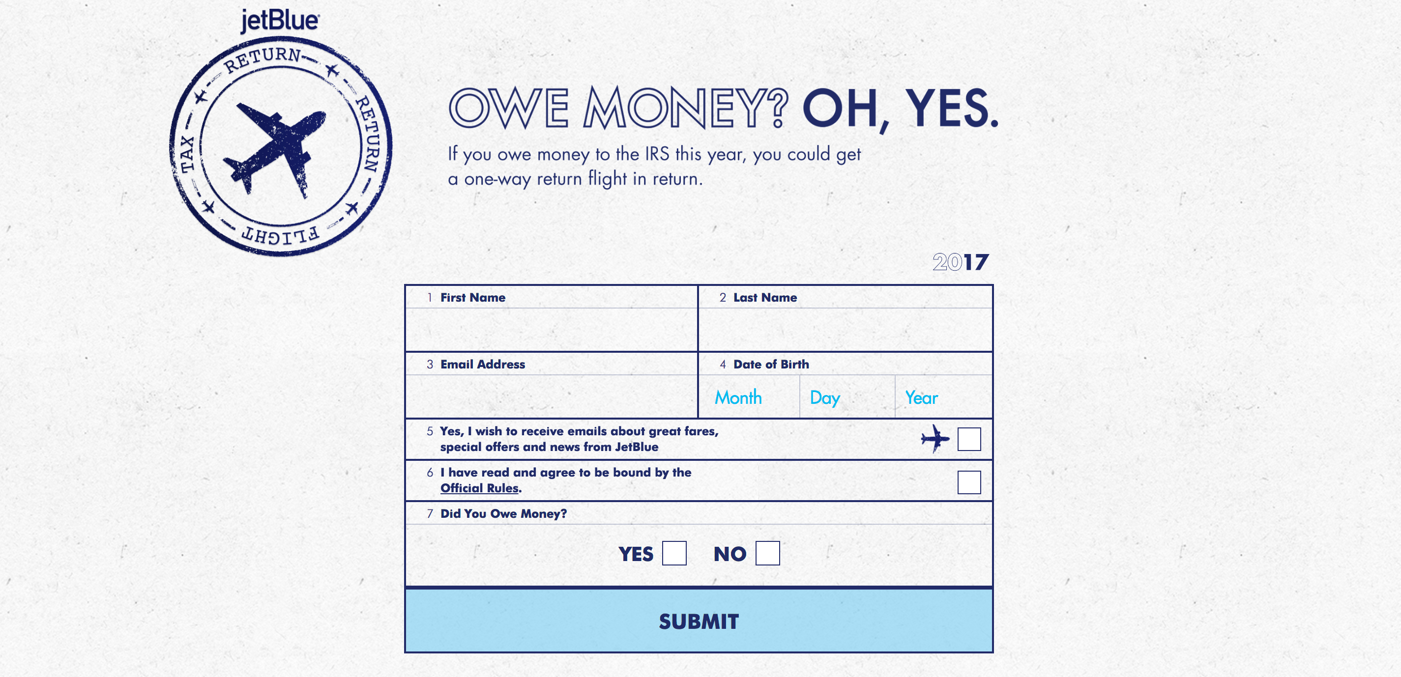 The Tax Return Return Flight giveaway started today, and now until the end of the promotion, you can enter one time per day. To register for the giveaway, you must visit JetBlue's dedicated site and enter your information by April 25, 2017 at 11:59pm ET.