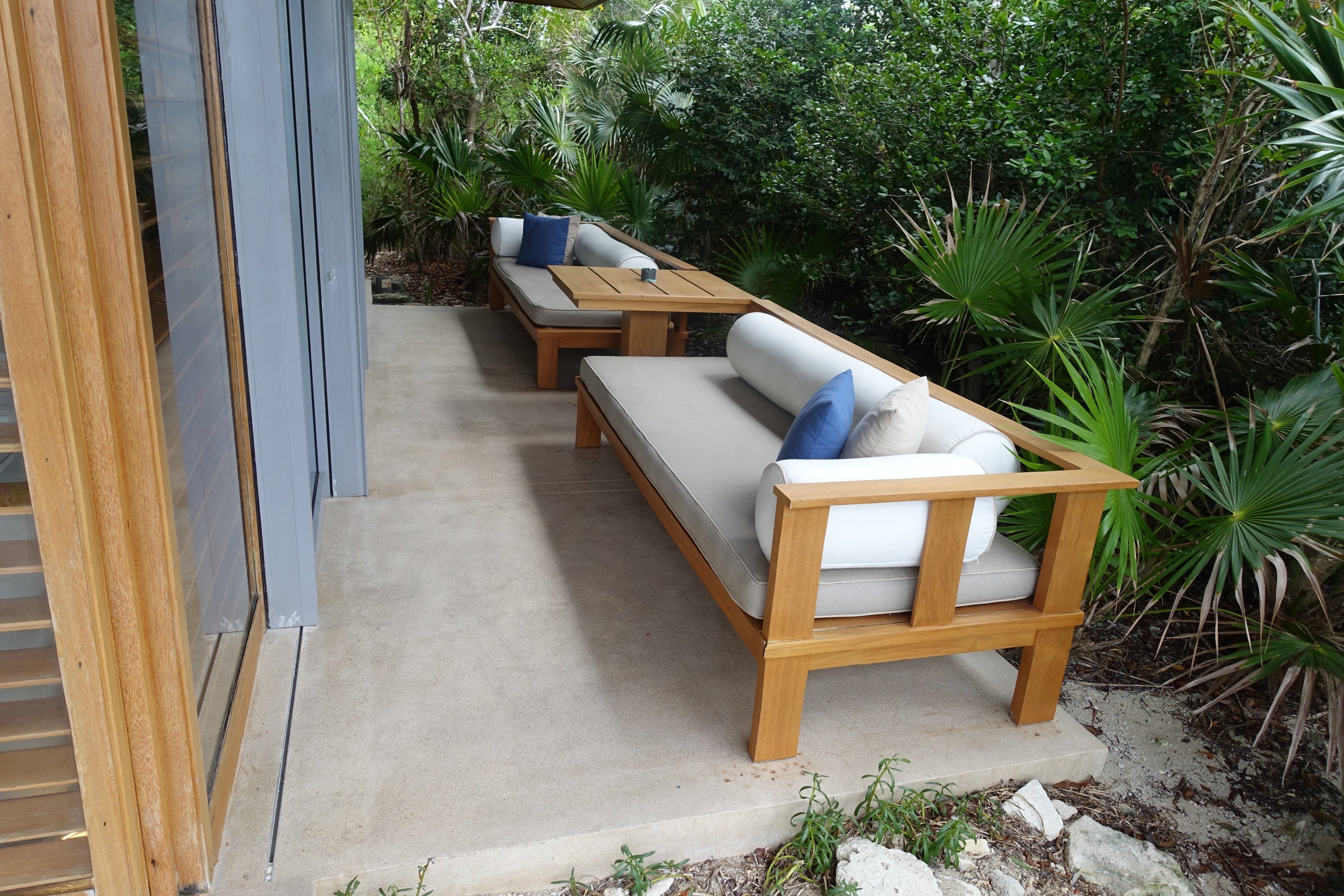 The outdoor table was sunken into the ground so for someone like me who is 6'7" it requires a little bit of negotiating. It's a cute touch but not the most functional piece of furniture.