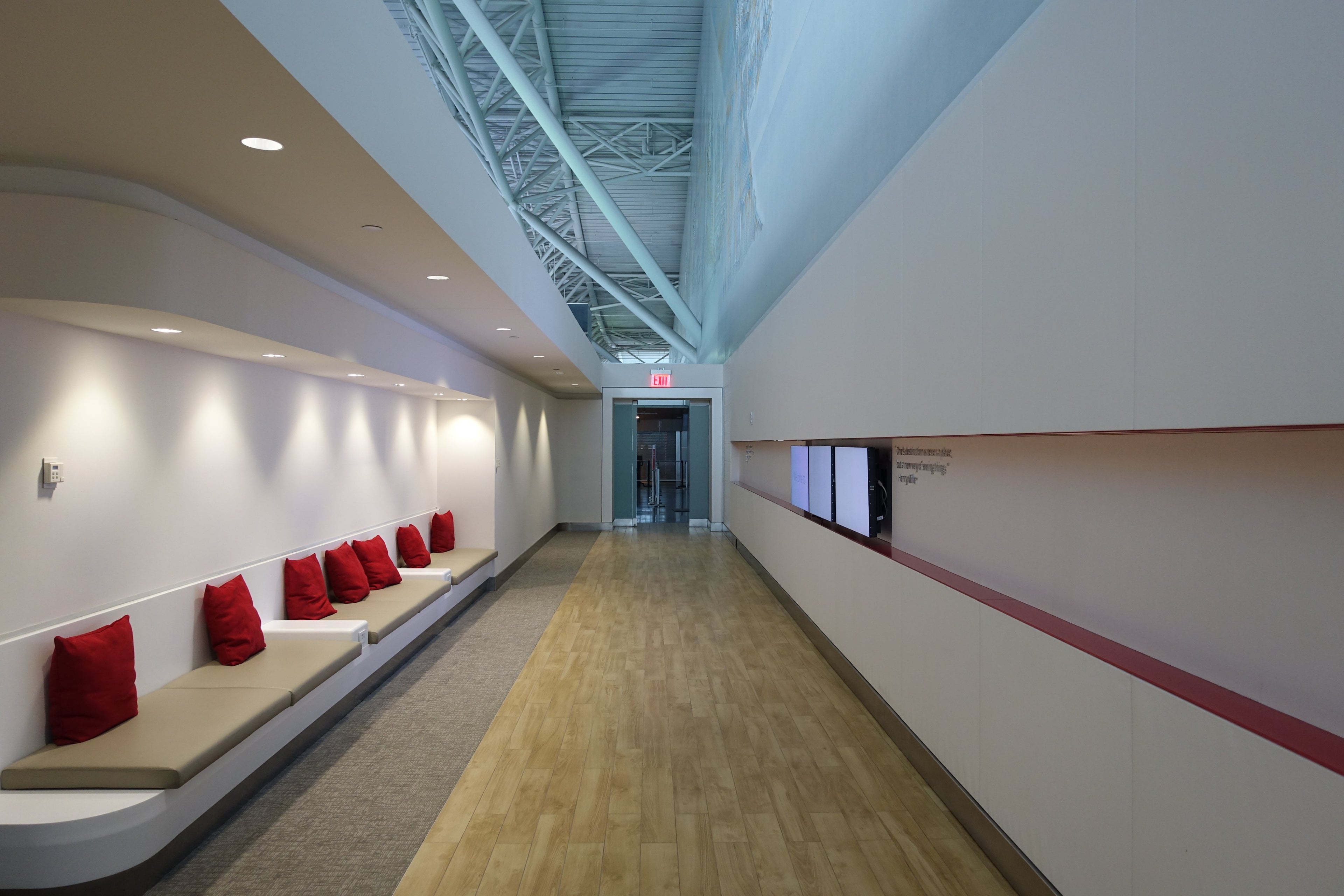 The rest of the check-in area features chairs and padded benches where passengers can wait before heading directly to the security checkpoint at the end of the narrow space.