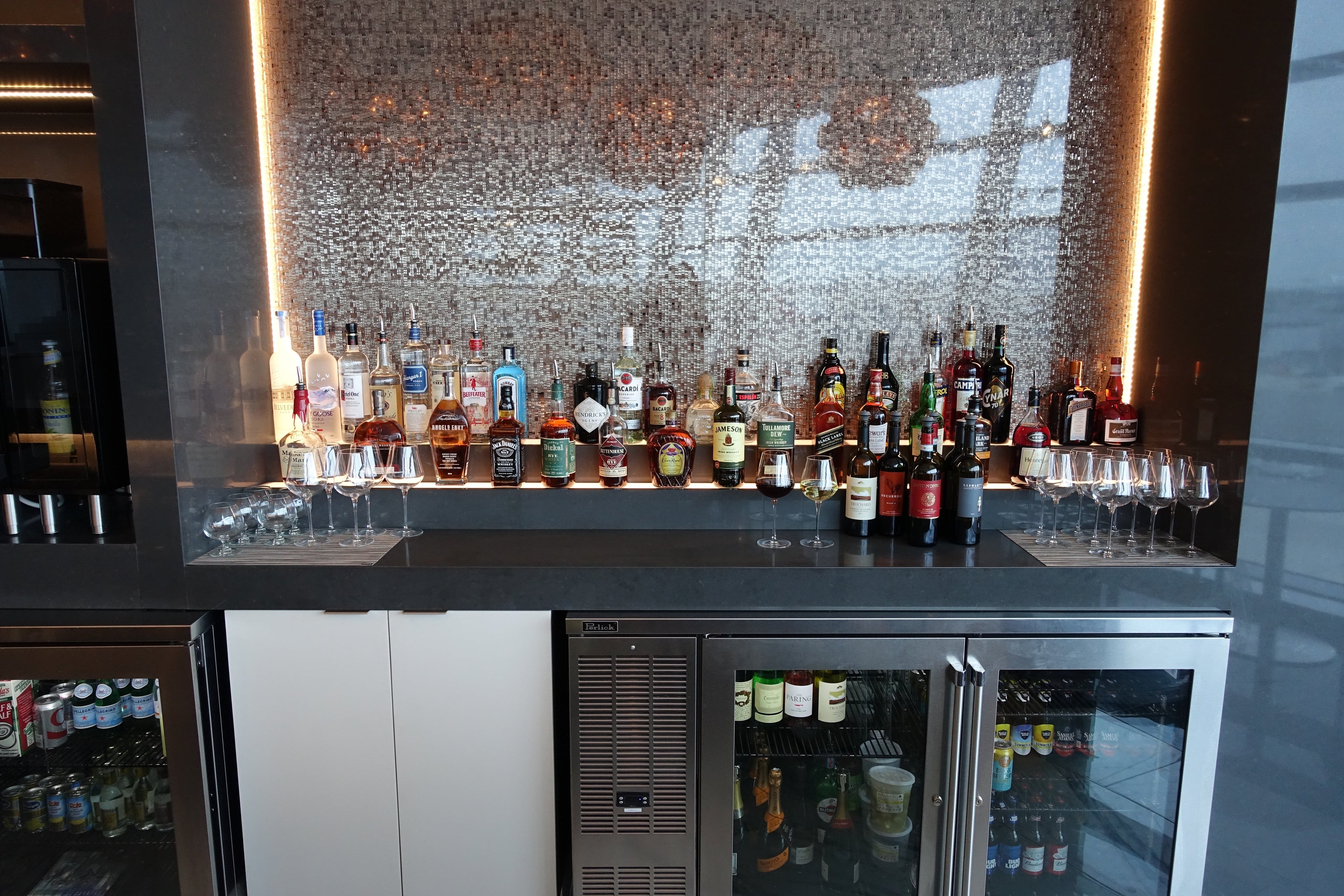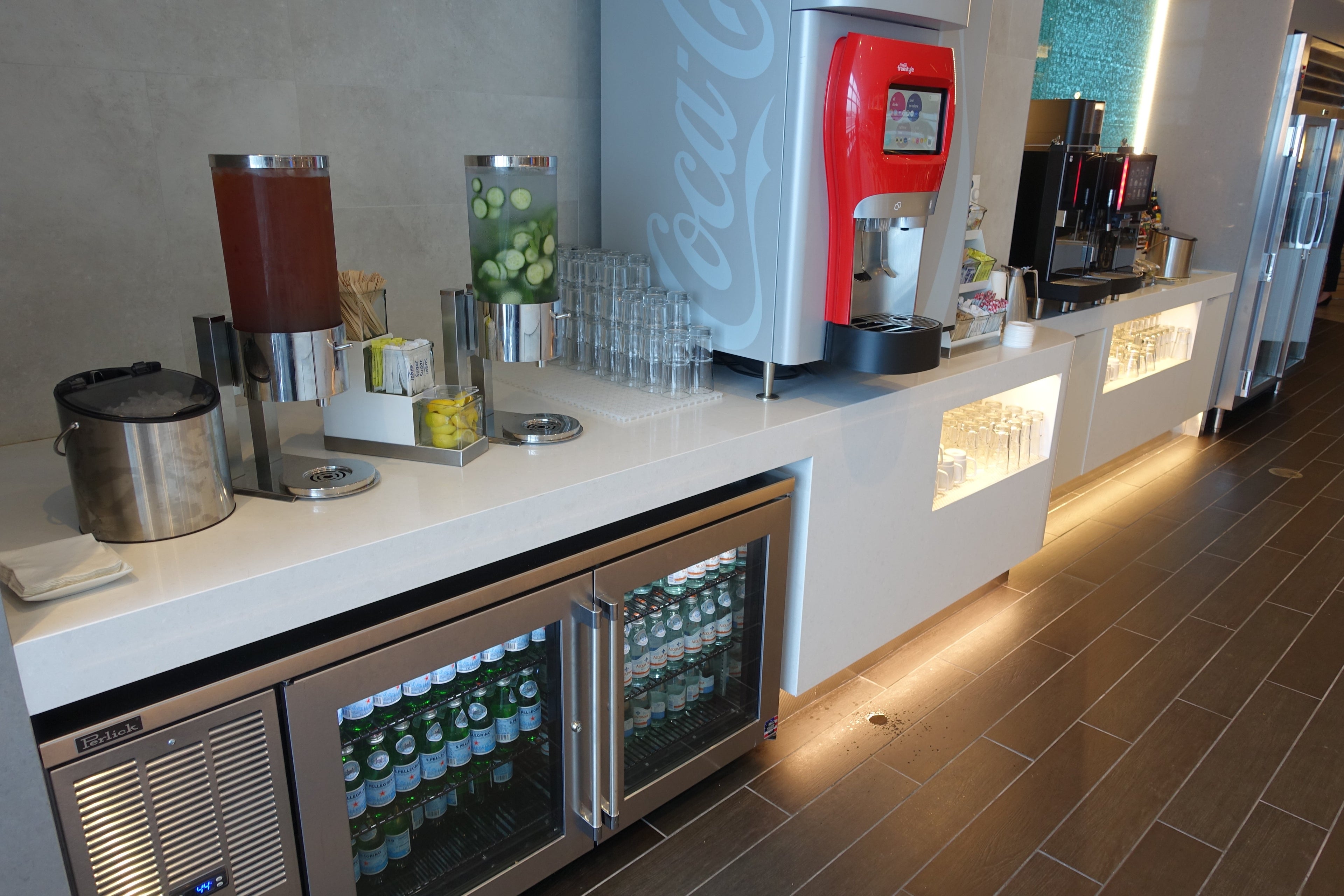 The lounge features several stations for self-serve beverages, including a coffee/water/soft drink station...