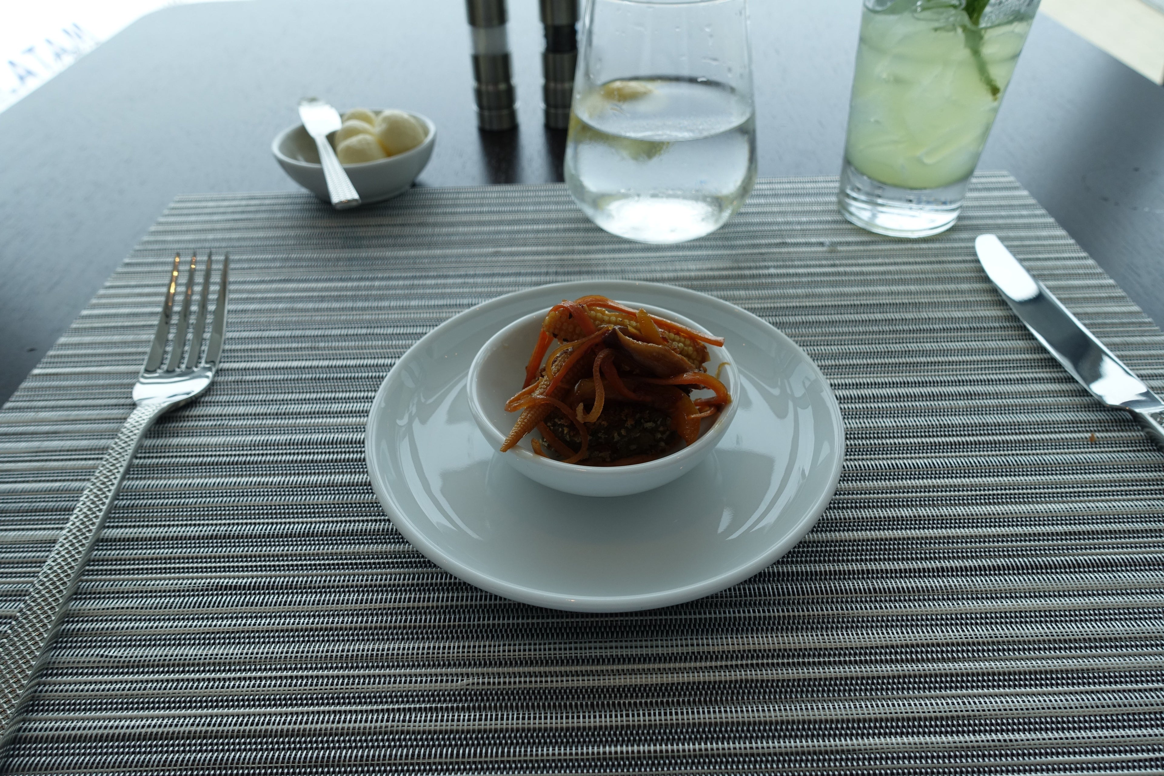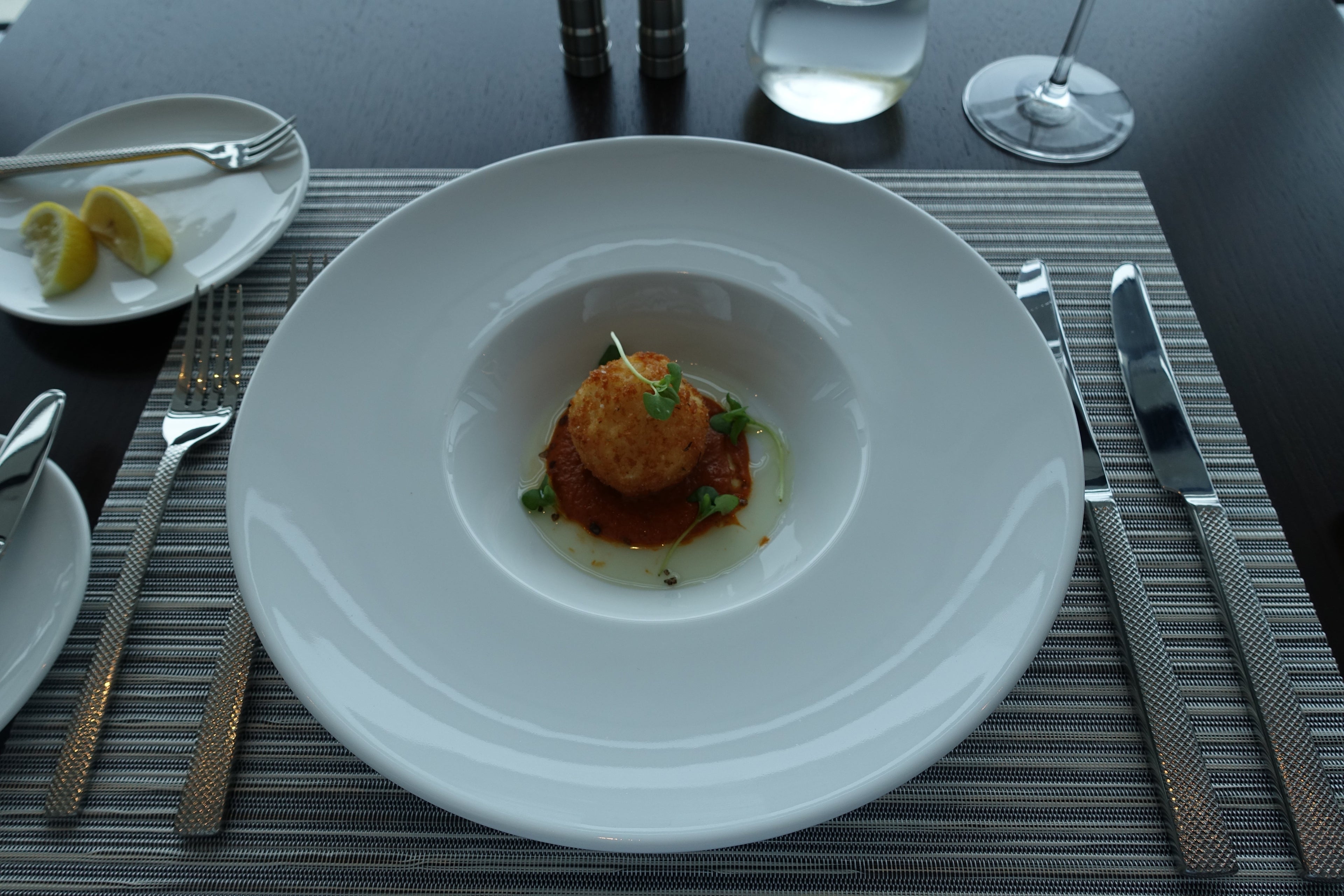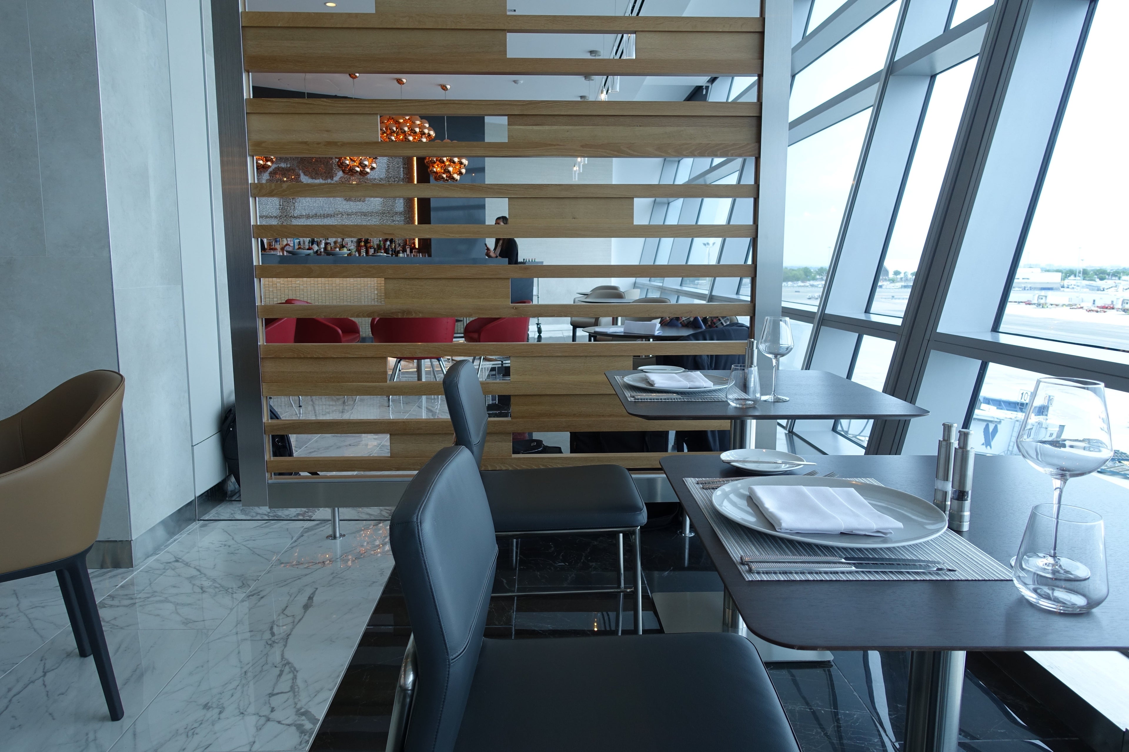 After about a half-hour of checking out the new lounge space, I was ushered into Flagship First Dining, which will only be available to passengers traveling in first class on board AA's three-class international and transcontinental flights. The space itself feels exclusive but not too small, and provides fantastic views of the tarmac. What's better than fine food and drink with unobstructed plane spotting?!