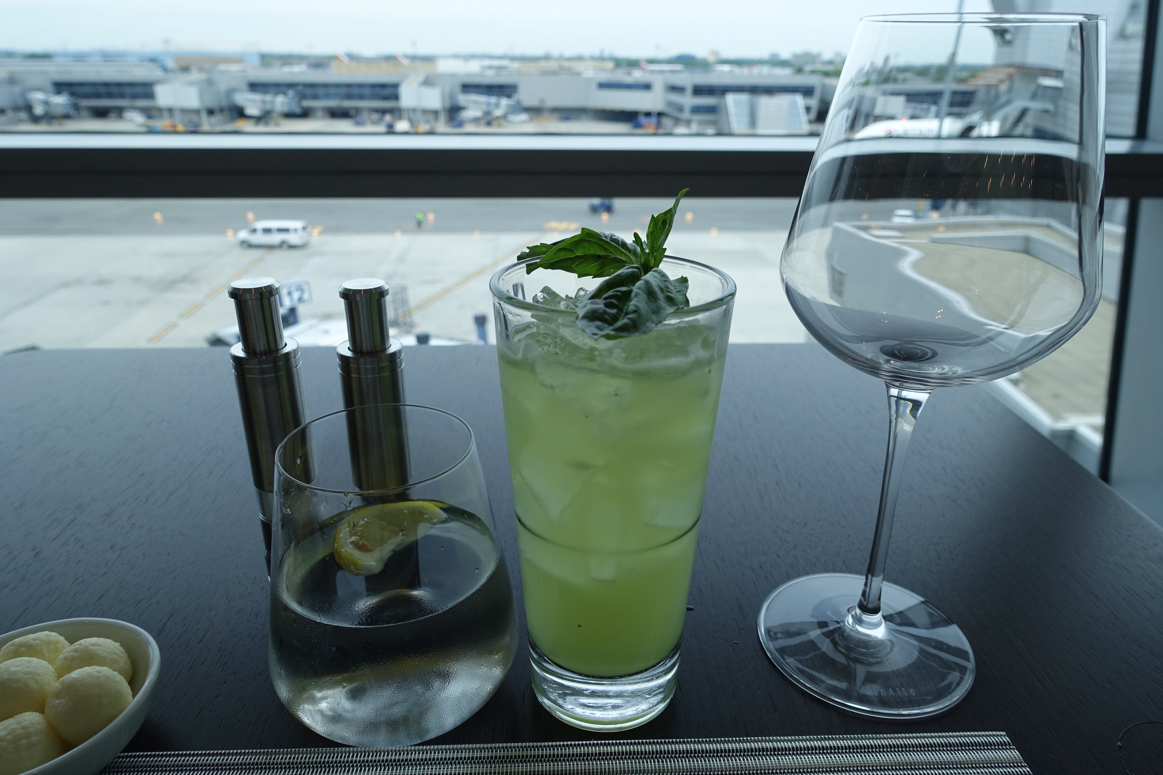 Once I was seated at my table overlooking the tarmac, it was time to eat. The waitress came over to me right away and took my drink order. I was struggling to decide, so she recommended that I try the Gin Basil Lemonade which was made with Brooklyn Gin, Barrow's Intense Ginger, fresh citrus, soda water and basil.