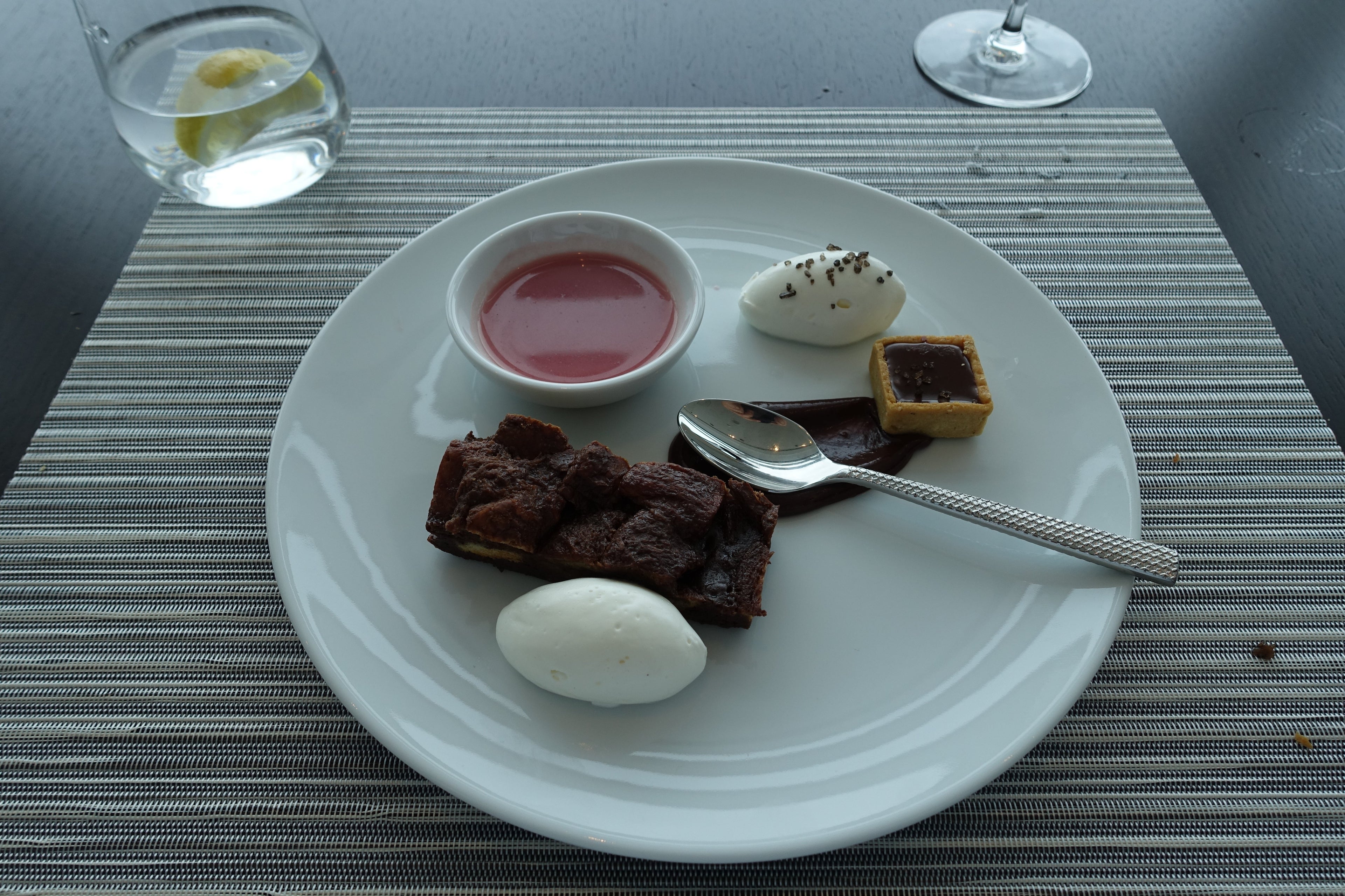 After finishing (almost) the entire burger, I couldn't even fathom the thought of having more food, but, it was time for dessert. I was served a dark chocolate brioche bread pudding with milk chocolate and smoked sea salt tart with white chocolate and strawberry syrup. Talk about decadent.