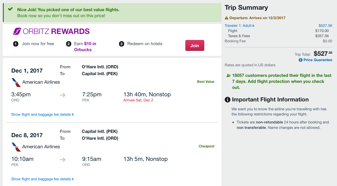 Chicago (ORD) to Beijing (PEK) nonstop on American for $528 round-trip via Orbitz: