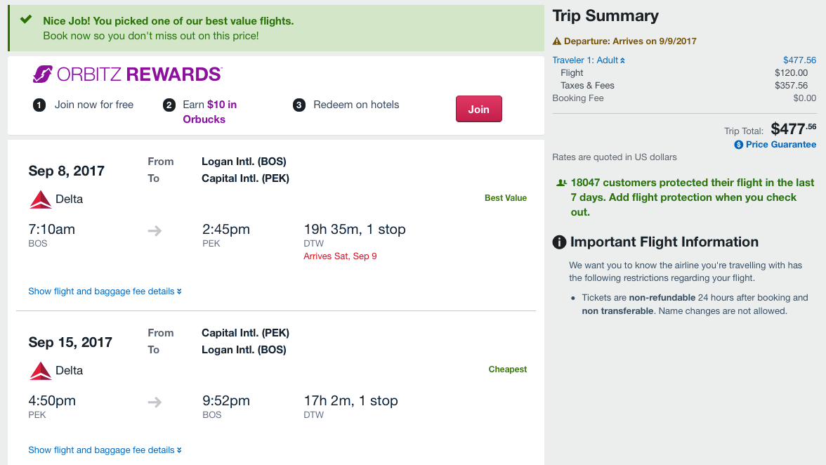 Boston (BOS) to Beijing, China (PEK) on Delta for $478 round-trip via Orbitz: