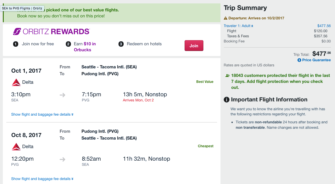 Seattle (SEA) to Shanghai, China (PVG) nonstop on Delta for $478 round-trip via Orbitz: