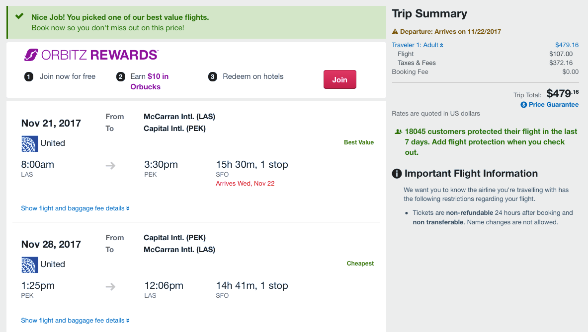 Las Vegas (LAS) to Beijing (PEK) on United for $479 round-trip via Orbitz:
