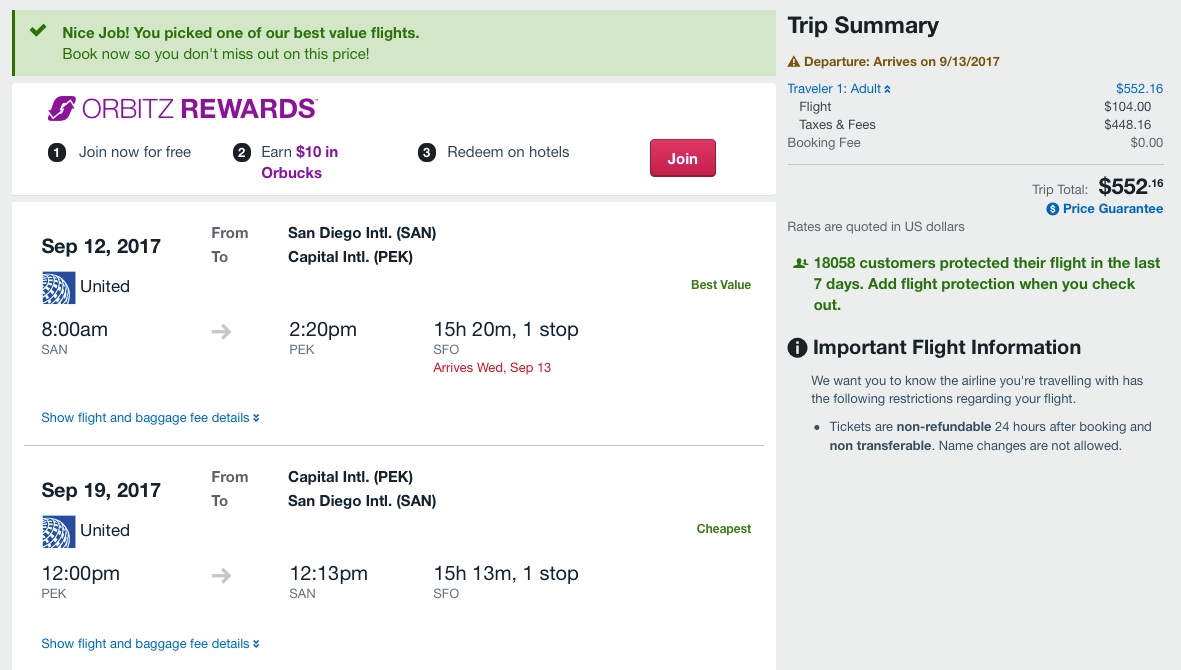 San Diego (SAN) to Beijing (PEK) on United for $552 round-trip via Orbitz: