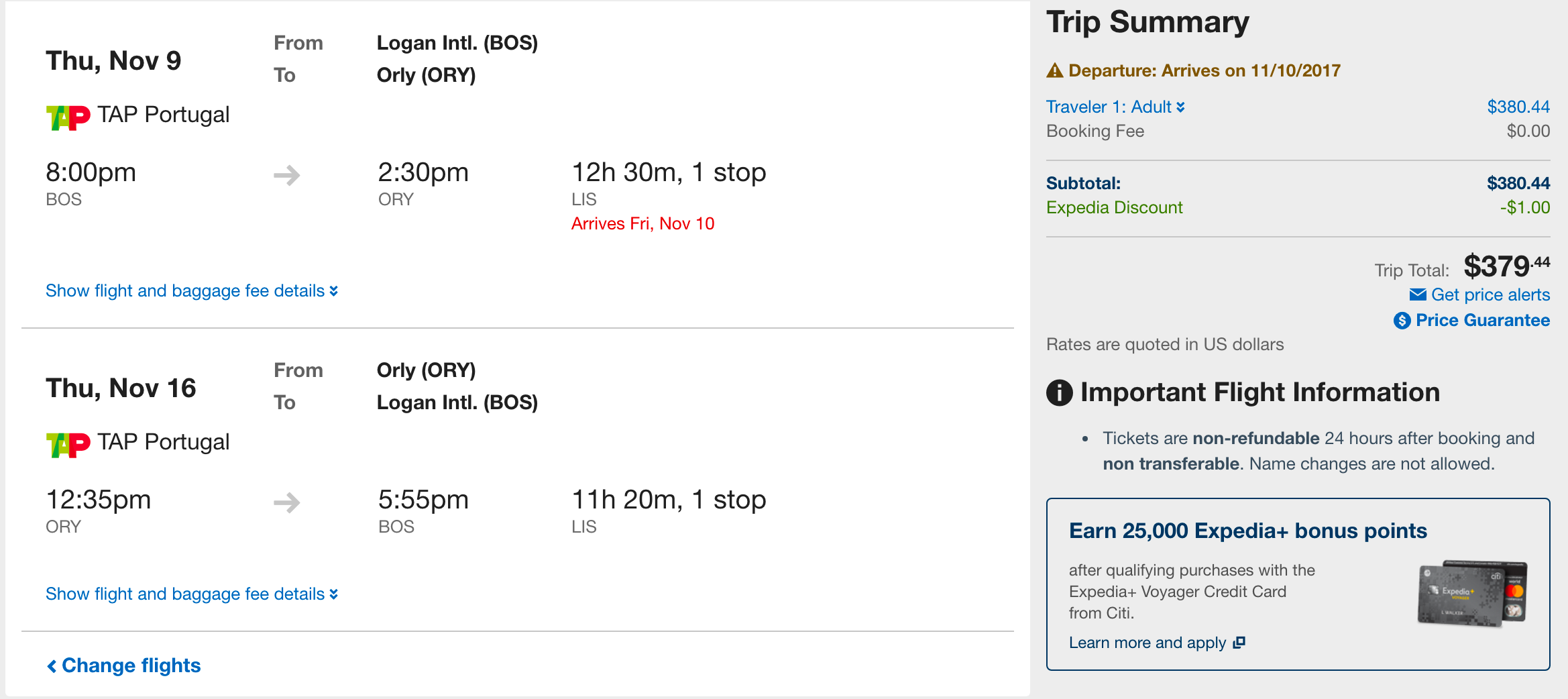 Airfare deals are typically only available on limited dates. We recommend you use Google Flights to find dates to fly, then book through an online travel agency, such as Orbitz or Expedia, which allows you to cancel flights without penalty by 11pm Eastern Time within one day of booking. However, if you're using The Platinum Card® from American Express, you'll need to book directly with the airline or through Amex Travel portal to get 5x MR points. Remember: Fares may disappear quickly, so book right away and take advantage of Orbitz or Expedia's courtesy cancellation if you're unable to get the time away from work or family.