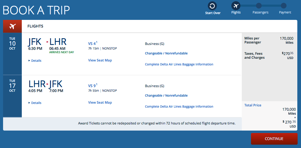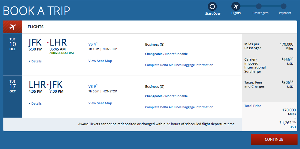 By adding the fee, the cost of an award ticket on Virgin Atlantic Upper Class shot up to over $1,200 along with the previously inflated partner redemption price of 170,000 SkyMiles. Compare that to the same route in Delta One business class, which runs only $270 plus 140,000 miles.