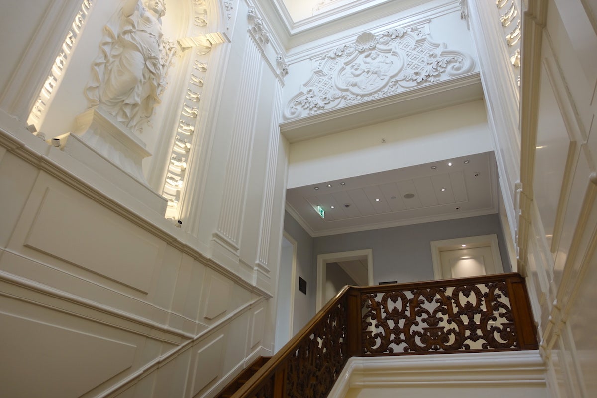 When we were finished talking, she walked me up the grand central staircase, a massive wooden fixture designed by renowned 18th-century architect Daniel Marot — and the only one of its kind still in the city. The walls and ceiling were decorated with enormous baroque sculptures lit by skylights. It was all very rococo, but fitting, and was a nice contrast to the other, more contemporary touches that characterized the rest of the hotel.