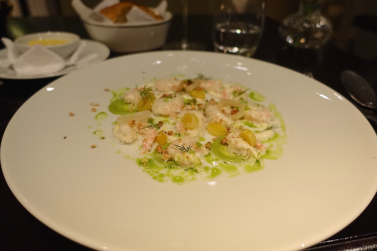 The menu at Goldfinch is a sort of Dutch-Asian fusion with an emphasis on seafood and Chinese spices. I opted for the two-course tasting menu because it was a bargain at just 36 euros (~$39), while the three-course menu clocked in at 46 euros (~$50). The brasserie menu started with a dish of plump little sturgeon shrimps dressed with dill and smoked buttermilk, pickled leek, parmesan and a sprinkling of seeds.