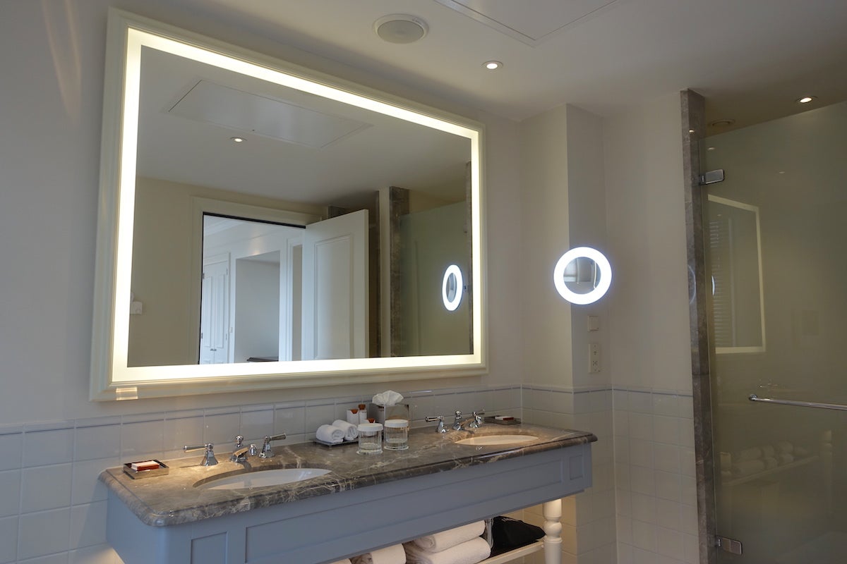 The bathroom was enormous, with white tiles and marble everywhere. It had two vanities with a marble counter, a giant mirror with backlighting and a magnifying mirror that lit up as well.