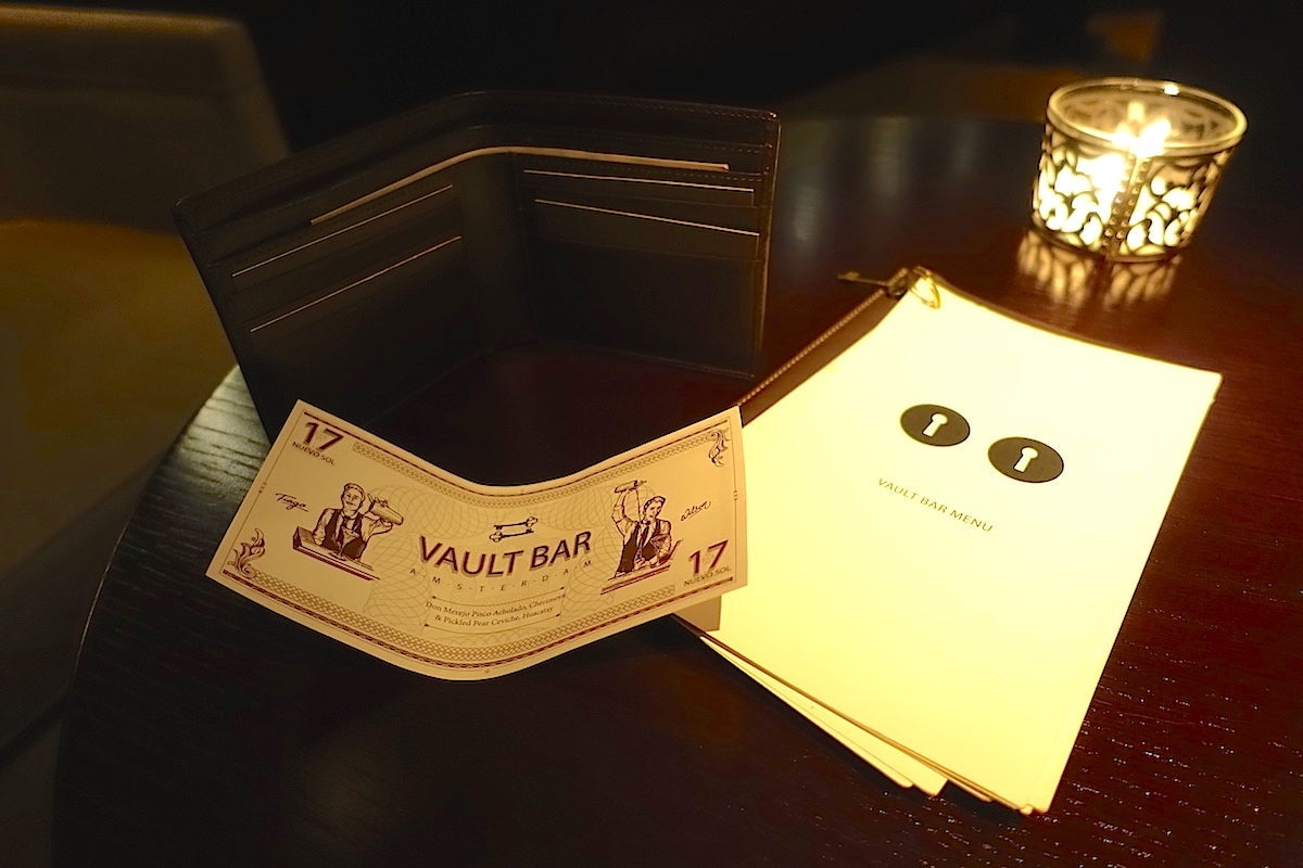My final stop of the night was at the Vault Bar, which is named that because... it's in a former vault that dates to when this particular house was part of a bank — you can even see old safe deposit boxes behind the bar and there's an enormous vault door to its secondary seating area, but it was closed when I visited. Instead, I entered through the other door and took a seat at one of the tables near the bar.