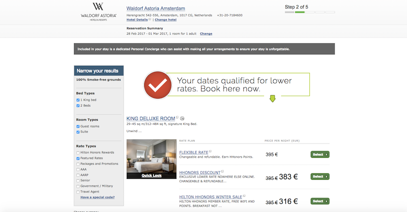 I was planning to stay on a Tuesday night in February, so as you can imagine, room rates in Amsterdam were relatively affordable. In addition to low-season pricing, there was also a special Hilton Honors winter sale going on at the time, so the rate for a King Deluxe room was discounted from 395 euros (~$432) to a much more reasonable 316 euros (~$345).