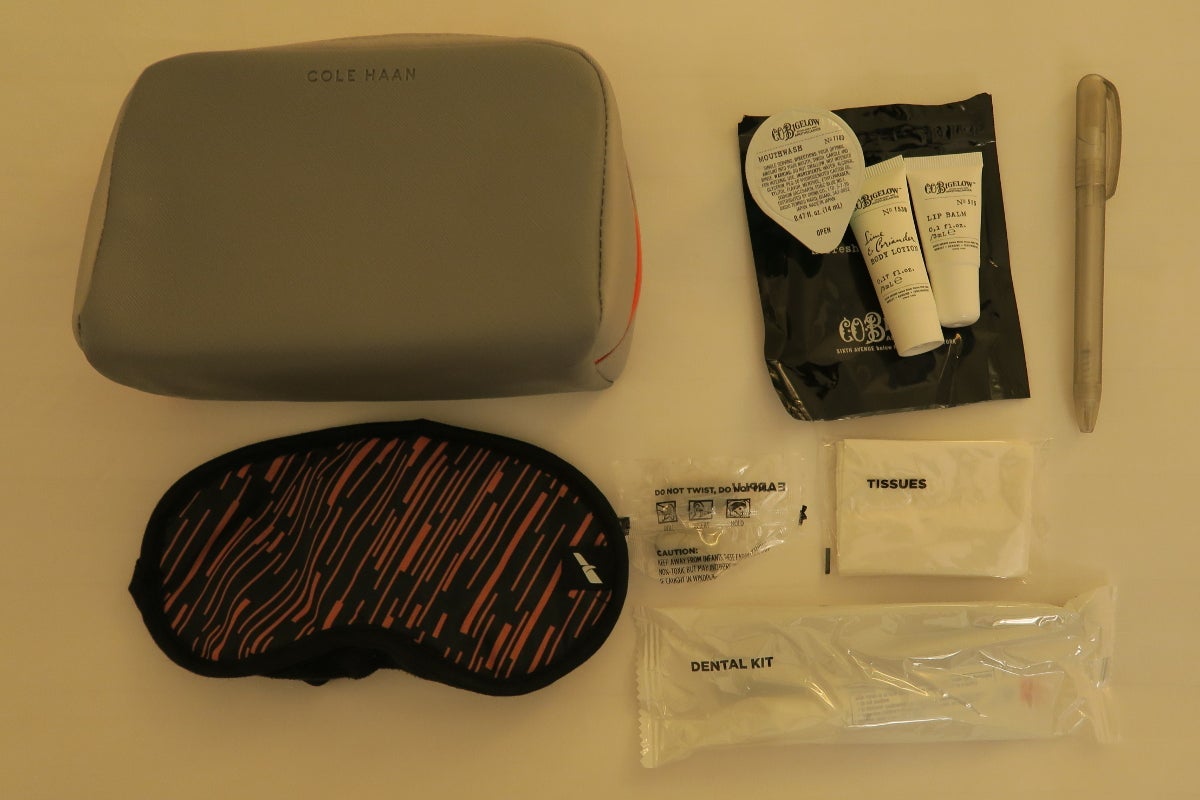 As I was boarding, a flight attendant hurried down the aisle ahead of me distributing business-class amenity kits from a black trash bag. Although this wasn't the most elegant way to present them, the amenity kits were just fine, consisting of a signature Cole Haan bag containing an eye mask, socks, earplugs, headphone covers, a pen, toothbrush and toothpaste, lotion, lip balm, mouthwash and tissues.