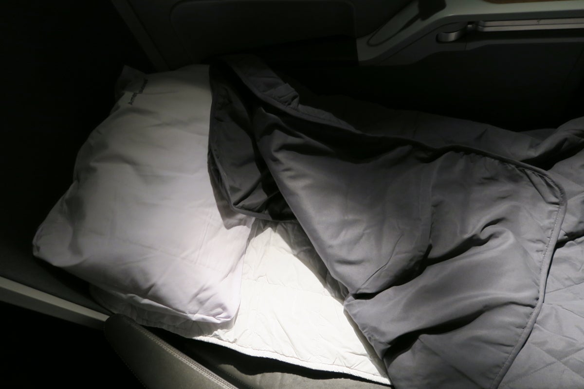 There was a bedding kit provided at each seat that contained a full-size pillow, a warm comforter and a mattress pad. After reclining my seat into a fully flat bed, I slept comfortably for four hours near the end of the flight.