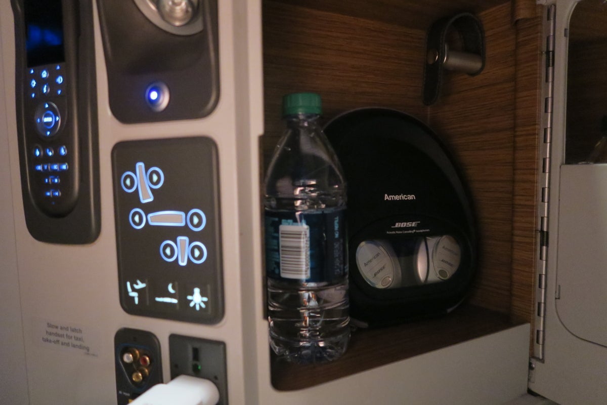 Each seat was stocked with Bose noise-canceling headphones and a water bottle in a window-side compartment. Slippers were also waiting at each seat. The Bose headphones were comfortable and worked well — they were collected an hour before landing, at which point I switched to using my own headphones.