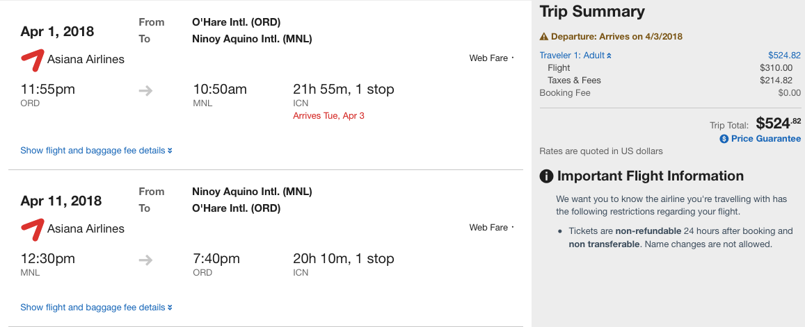 Chicago (ORD) to Manila (MNL) for $525 round-trip: