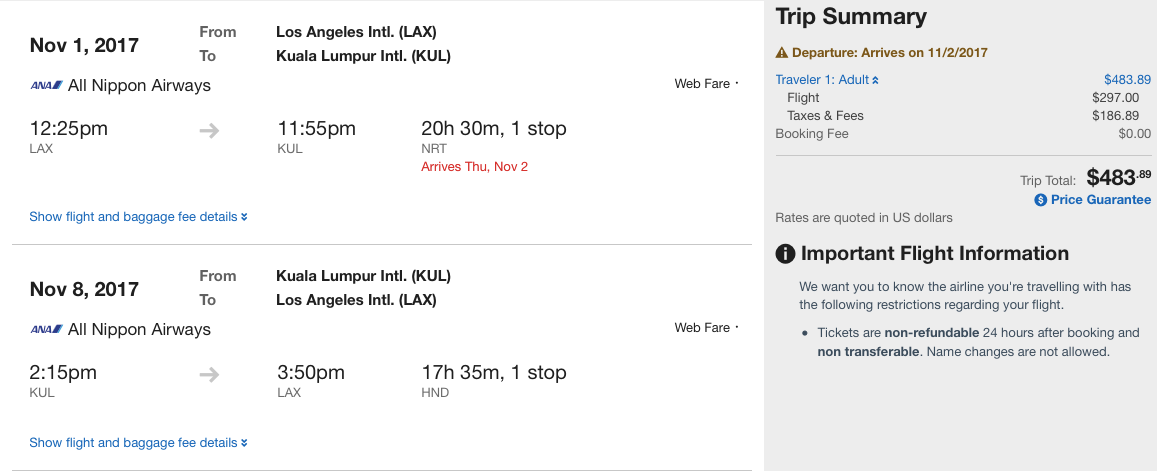 Los Angeles (LAX) to Kuala Lumpur (KUL) for $484 round-trip: