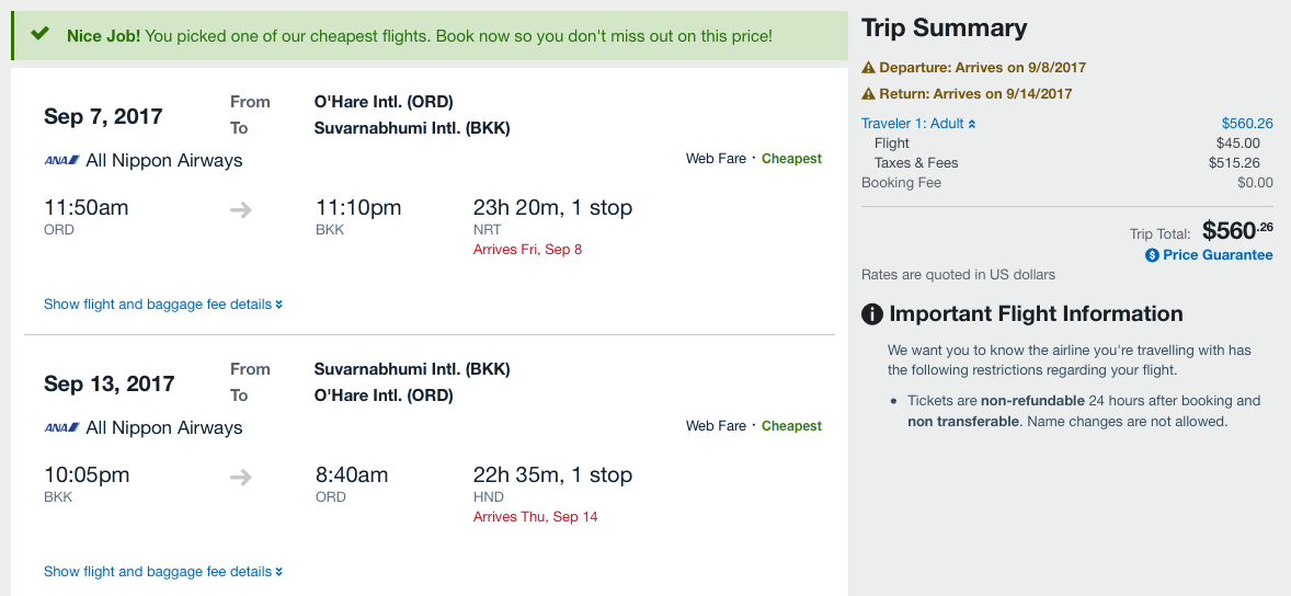 Chicago (ORD) to Bangkok, Thailand (BKK) for $560 round-trip via Orbitz: