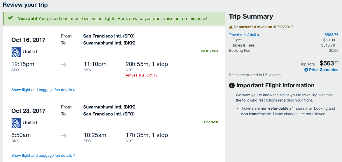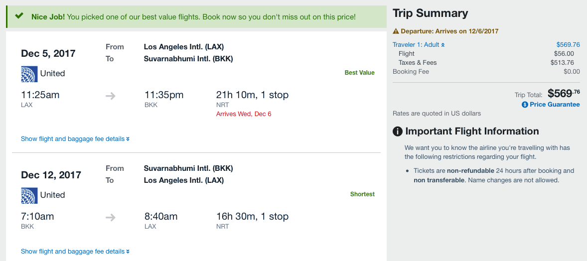 Flights are mostly available from September through early December, although itineraries from New York and Washington DC are open all the way until April 2018. You don't need any tricks to see these airfares — just use Google Flights to find the dates you want, then book on Orbitz, Expedia or directly with the airline itself. Bangkok is a great hub for Southeast Asia travel as you can usually find cheap flights from there to Phuket, Koh Samui or elsewhere in Southeast Asia.